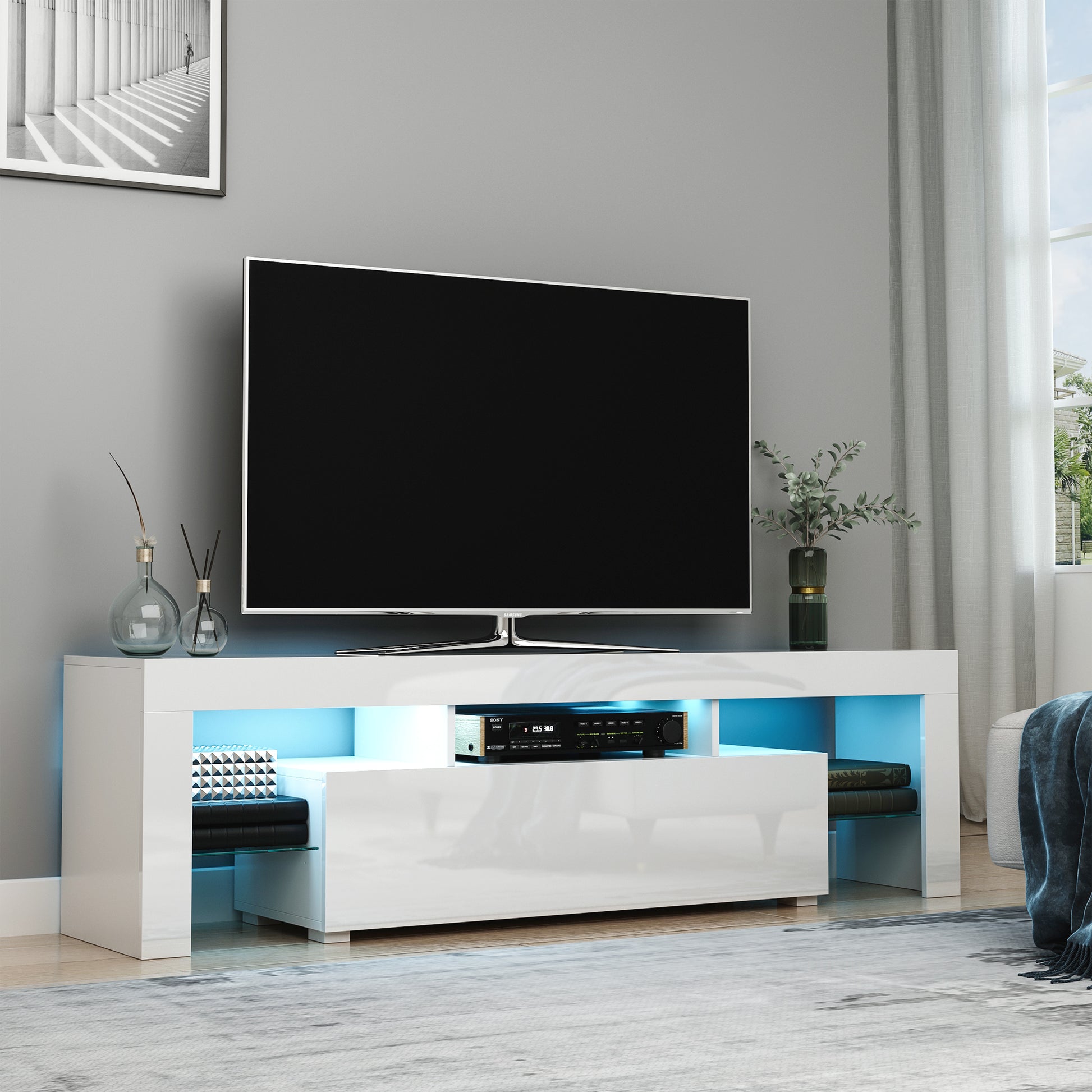 - Large Storage Space: The long deck is suitable for placing most TVs such as LCD, flat panels, or curved TV. Features 3 open shelves, a large drawer and two glass adjustable shelves, this TV cabinet is perfect for storing remotes, game controllers, media cases and more