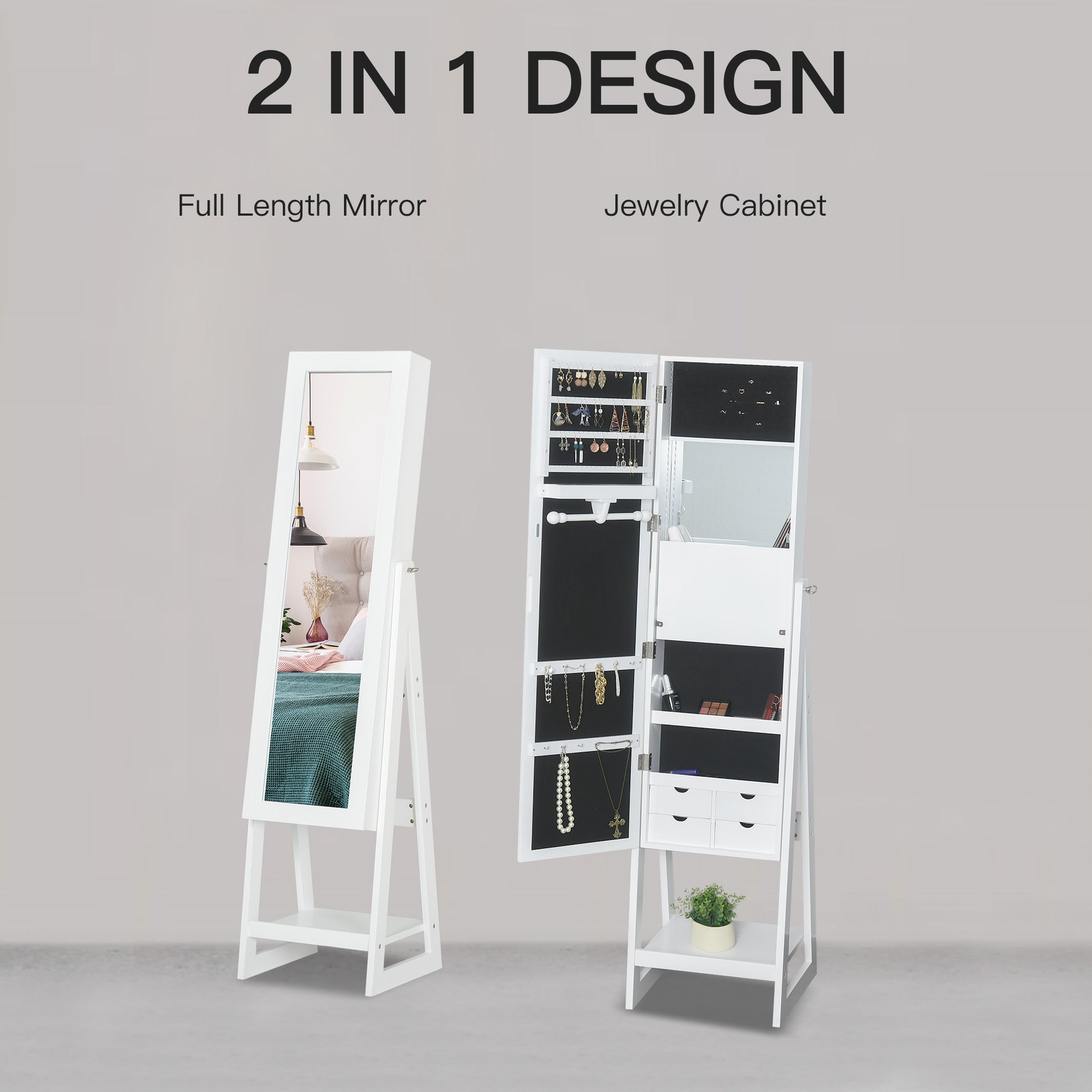 Fusing an elegant design with clever and discreet storage is this jewellery storage mirror from HOMCOM. On the outside, a full-length mirror is placed for you to get ready everyday, with the angle adjustable to suit you. Inside features 80 earring slots, a bracelet hanger, 12 necklace hooks, 98 ring slots, a fold-out panel, two storage shelves, three boxes and four slide-out drawers, giving you more than enough to keep everything stored.