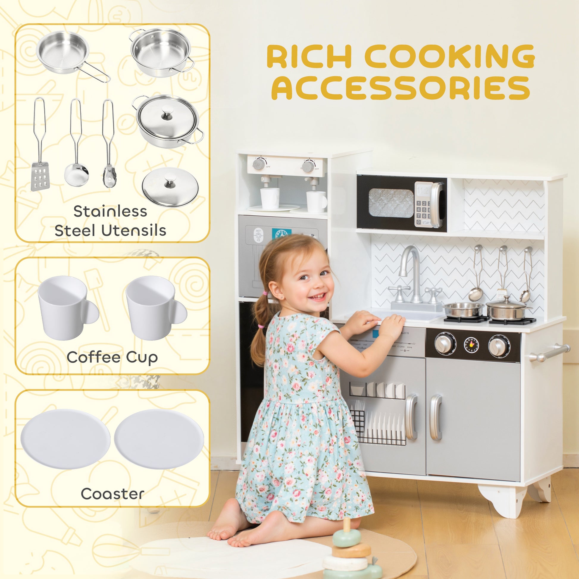 Their very own kitchen to get creative, this kids kitchen playset includes a pretend ice maker, coffee machine and stove top with realistic sounds – a charming setup that lets imaginations soar. Includes stainless steel accessories and play mugs, children can roleplay serving their favourite meals. The spacious storage provides a tidy play area, keeping accessories organised. A wonderful blend of fun and learning, it offers endless enjoyment while teaching kitchen etiquette.Specifications