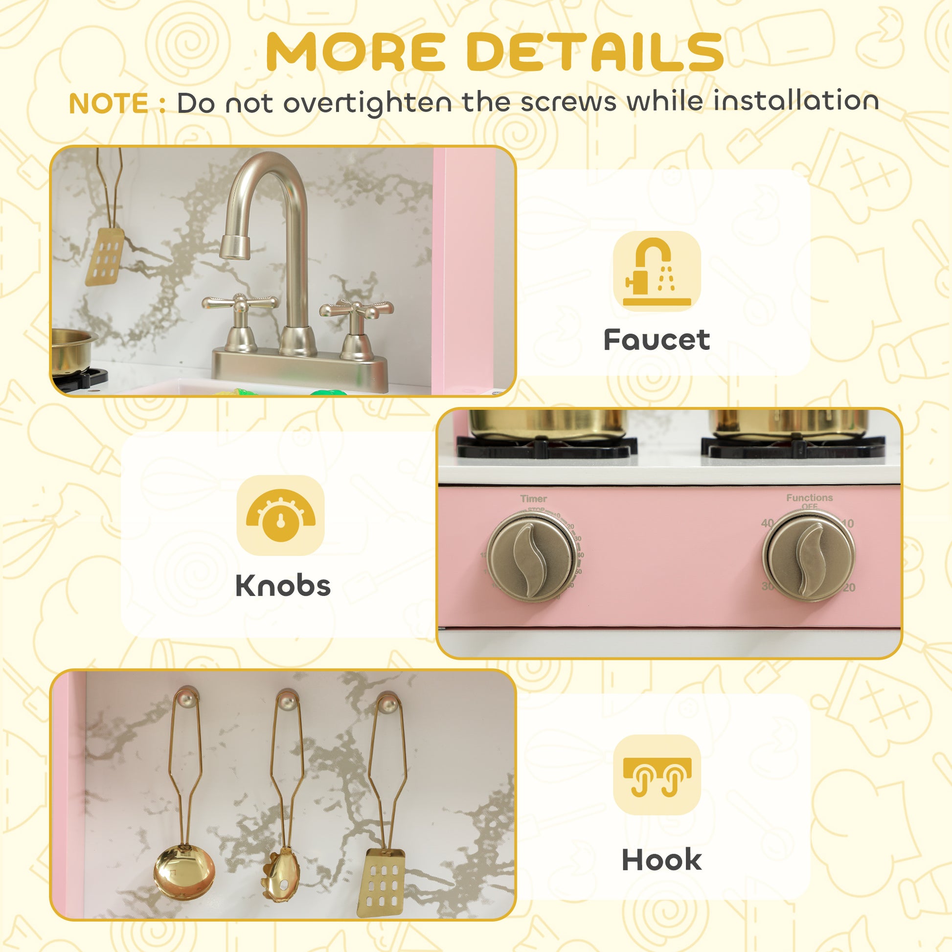 It's time for little chefs to shine with the all-in-one kitchen toy set! Featuring pretend essentials like a microwave, cabinet and kitchenware, it sparks imaginative play and helps kids learn daily routines. Enjoy hosting pretend dinner parties together, creating bonding moments and lifelong memories.Specifications