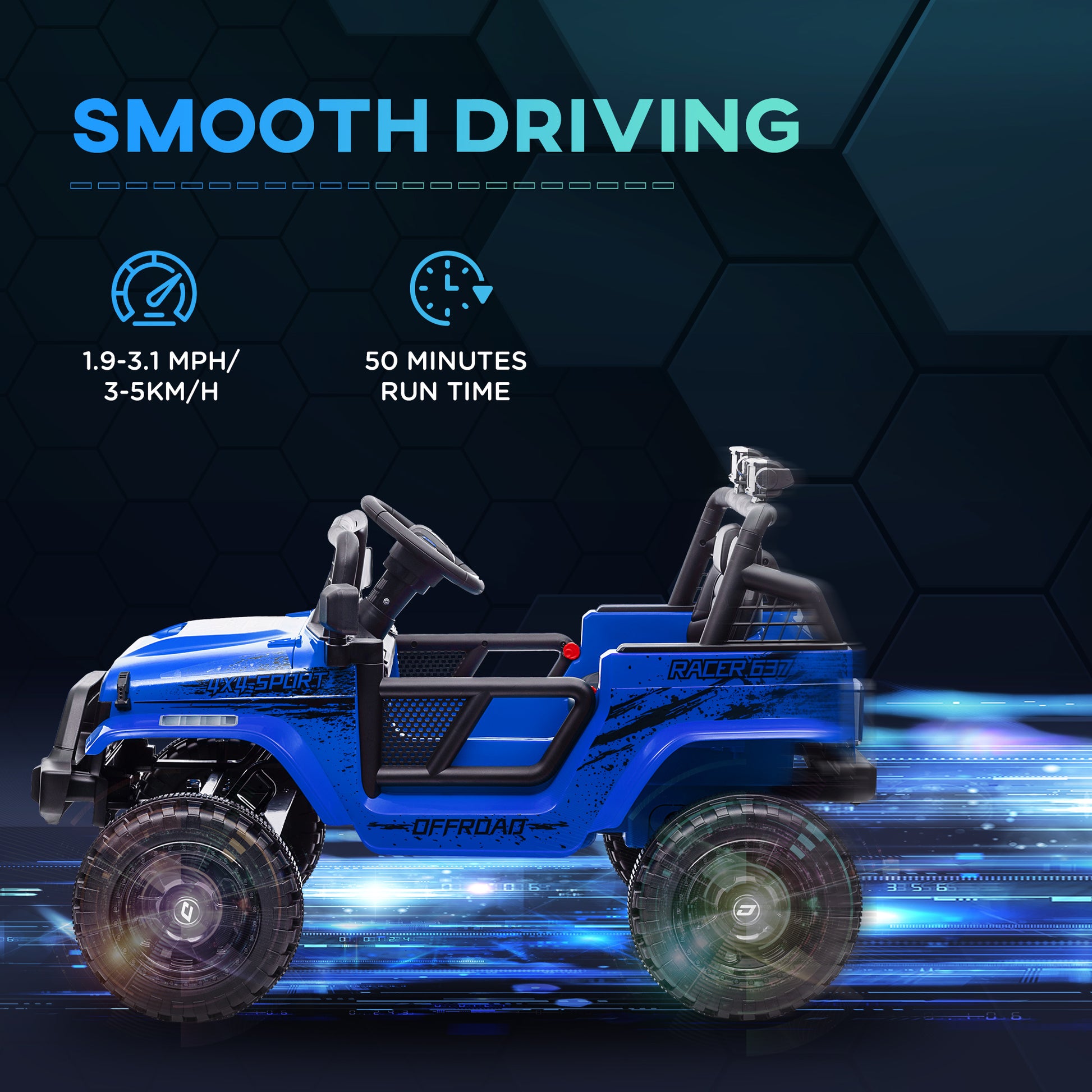 - 12V dual motors allow 50 minutes of continuous fun