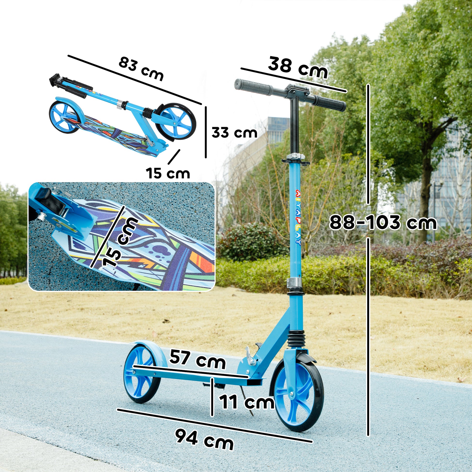 Outdoor fun is made possible with the kids scooter. Designed to grow with your child, it features four adjustable levels from 88cm to 103cm, suitable for ages 6-12 years. Smooth riding on various terrains, thanks to its front fork with shock absorption, it glides effortlessly on grass, gravel and cement. The rear brakes provide safe and swift stops. When finished, simply fold it for easy transport and space-saving storage. Great for little explorers ready for exciting adventures.Specifications
