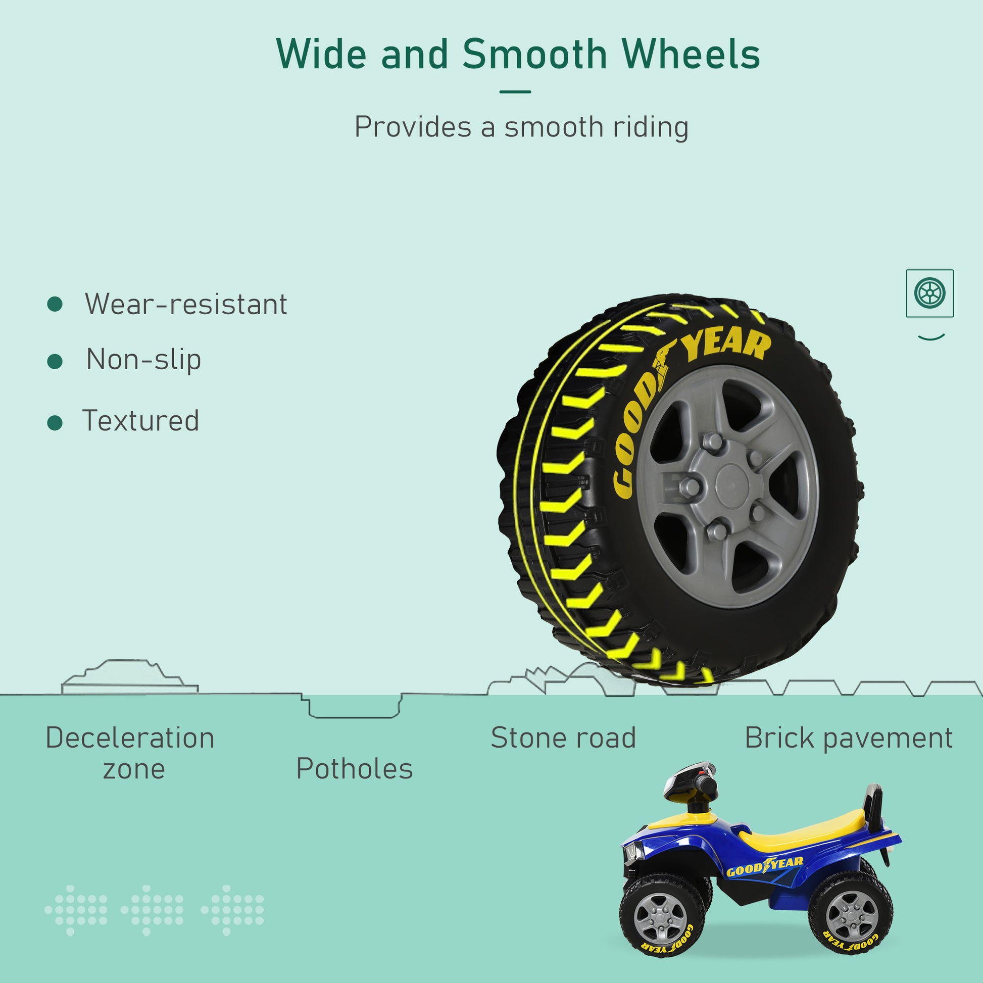 • Two handles for them to hold on to, also controls the direction of ride-on moving