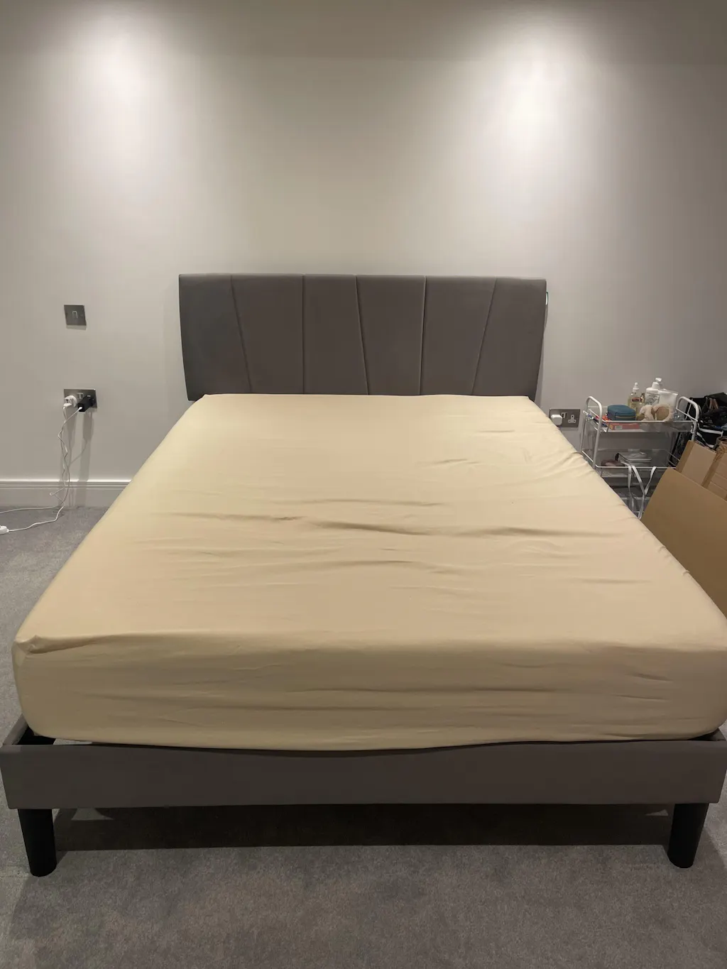 Drift softly into sleep with this king bed frame. The velvet-feel headboard design brings a soft and luxurious touch to bedroomsset it between five different positions to cater for different mattresses. Thanks to the metal frame for a strong core, it comes with 12 wooden slats to support the mattress in place. Complete with a 20cm under-bed clearance for discreet storage.
