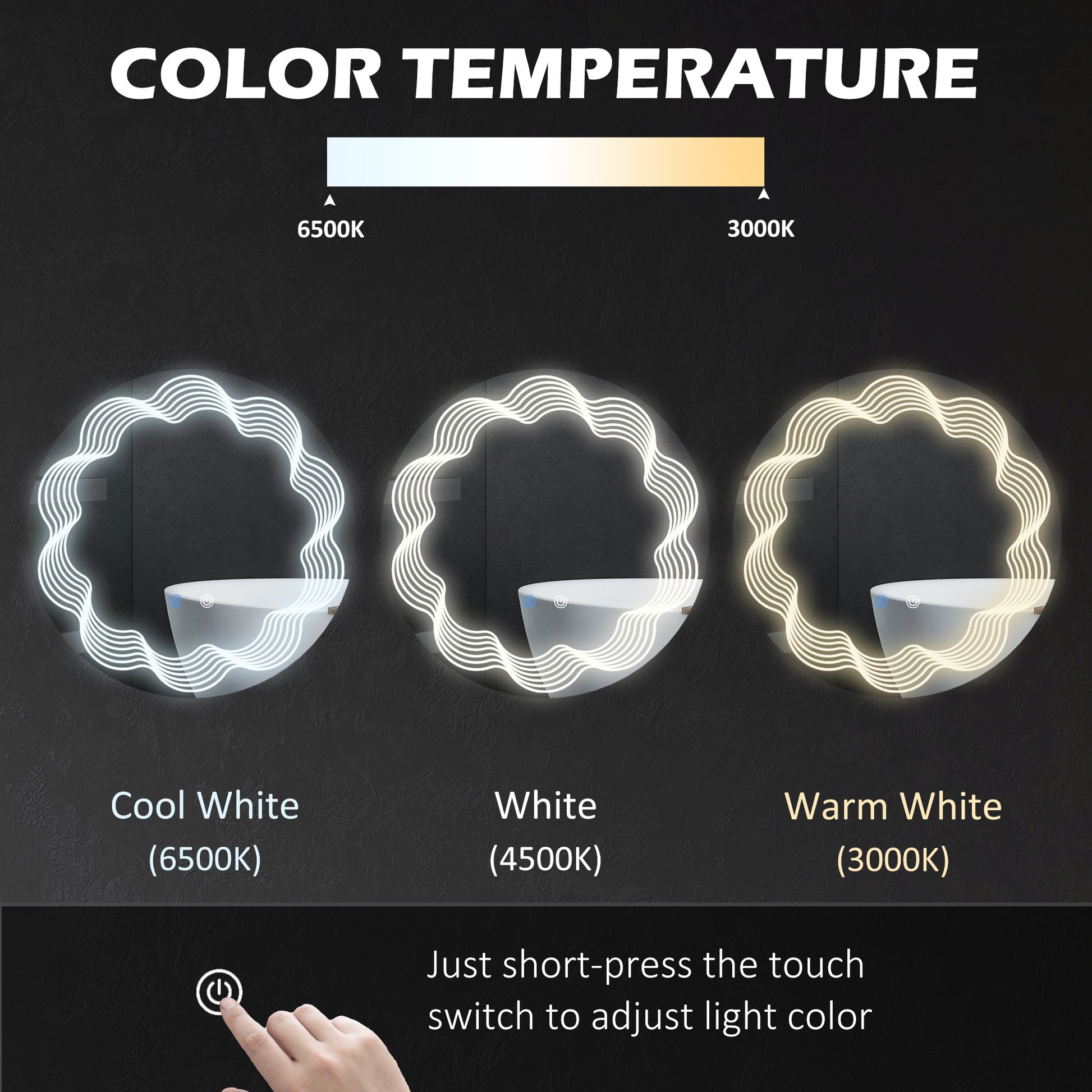 - Adjustable lighting: This LED mirror features adjustable light brightness and 3 light colour, including Warm White (3000K), White (4500K) and Cool White (6500K) LED lighting. Providing higher brightness at lower energy costs and with 50,000 hours long lifespan, which means 27 years using if it works 5 hours per day.