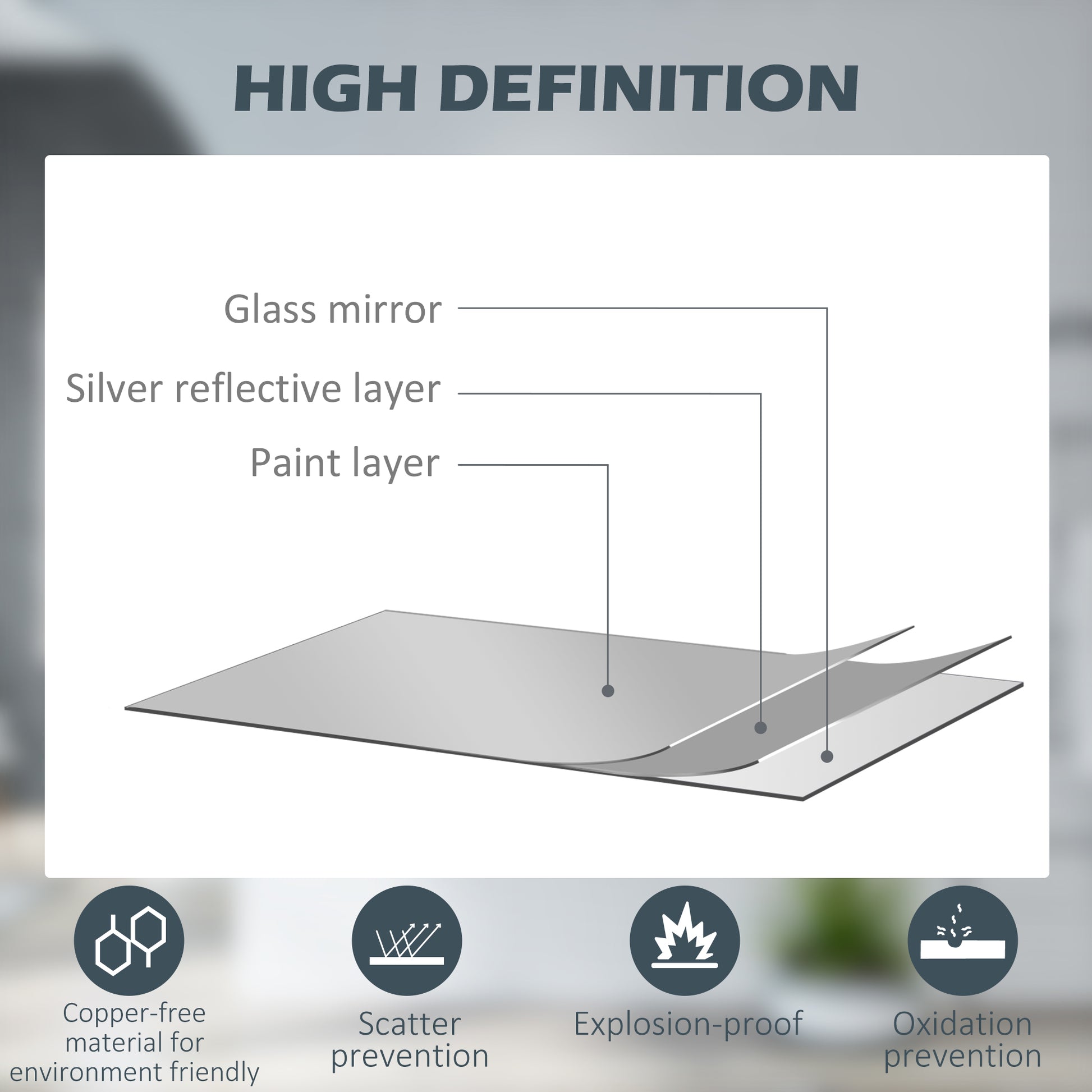 - Thick glass with silver coating and copper-free multi-layer design, for heigh-definition, no explosion, no oxidation