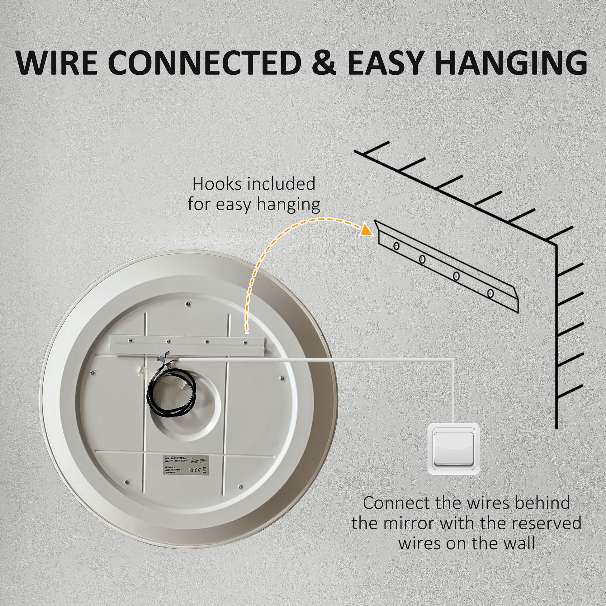 - Quality material: Made of thick glass and copper-free ecologically responsible material, this bathroom wall mirror with silver coating presents a clear and beautiful reflection, with scatter prevention, explosion-proof, and oxidation prevention for security. Also, the IP44 waterproof rating and integrated moulding metal back is especially suitable for humid bathroom. Wire connected, No Power Adapter Included. Just simply fix to the wall with straight hanger