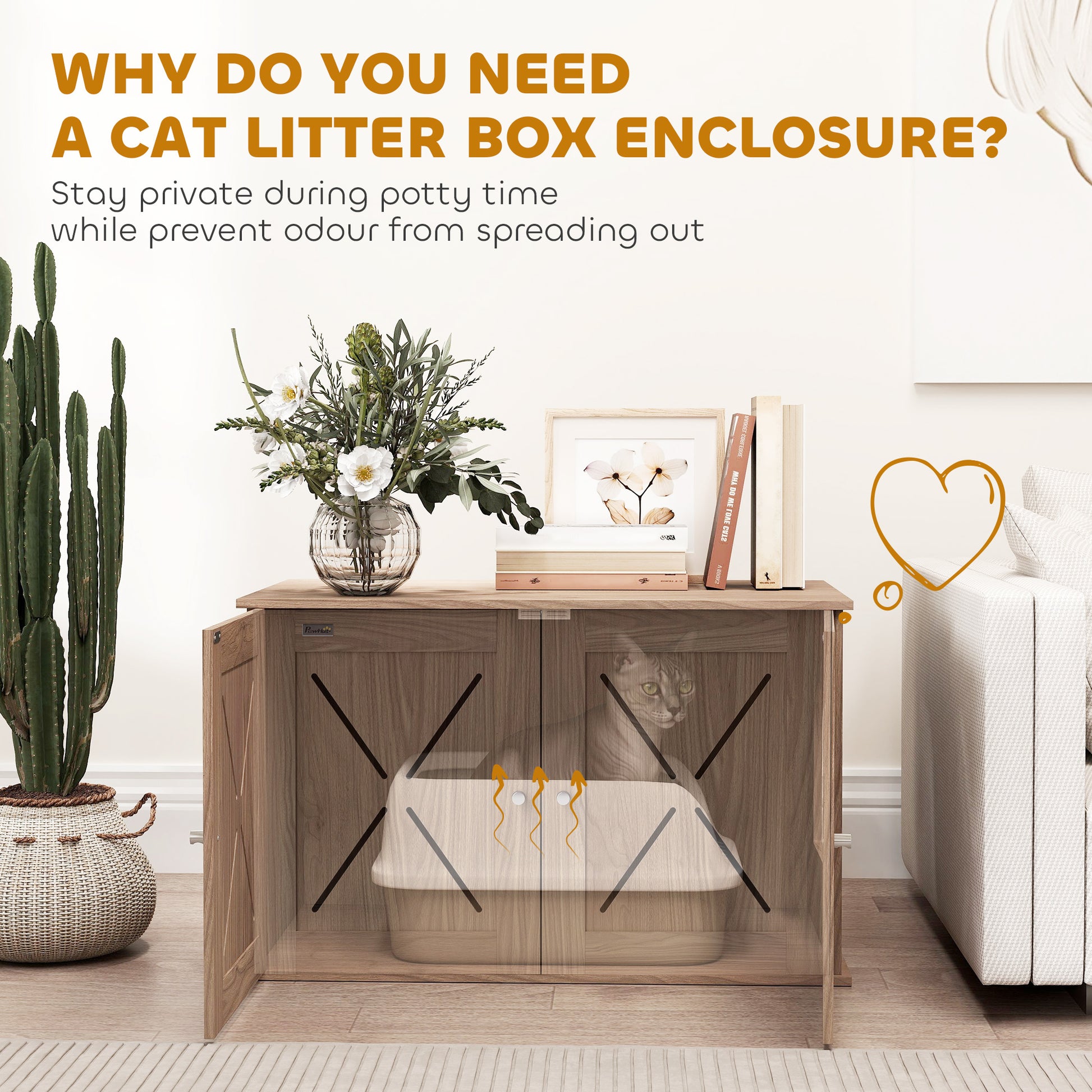 - Hides litter box, maintaining a neat appearance