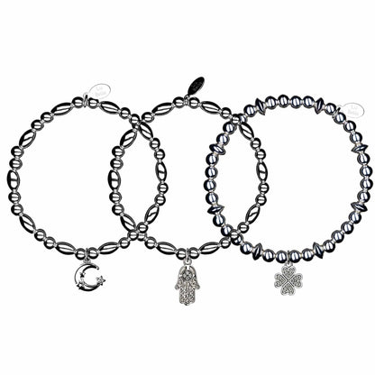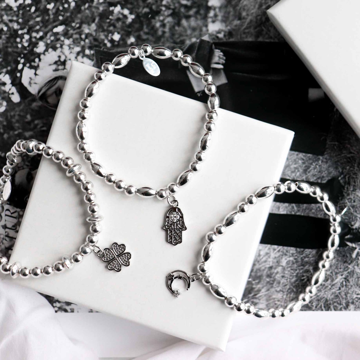 Made for Luck and filled with Love our beautiful our set of 3 silver stacking features our beautiful 4 leaf clover with mixture of 5mm Oval Disc and Round beads, our Hamsa hand charm bracelet that symbolise protection, good luck and good fortune and one of our most popular additions to the Stackable collection - the "Love to the moon and back" with Moon charm that is detailed with stars and includes a dainty cubic zirconia stone.
