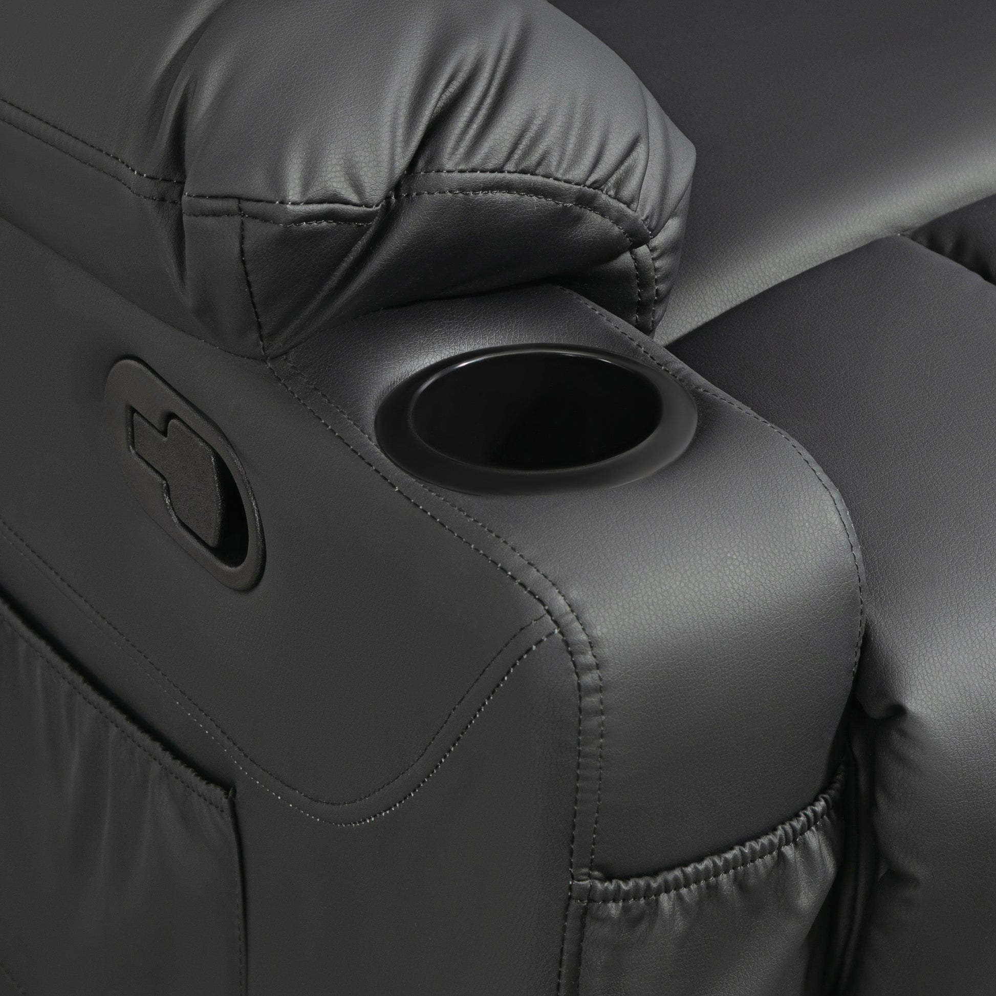knows the first thing you want to do after a long work day, is relax. This cinema chair gives you the perfect spot to do that. A large square shape to give you plenty of room to sit, it thickly padded all over - simply sit down and sink in. Features a 135° reclining back, with manual footrest for extra relaxation. Faux leather upholstery for style, complete with two cup holders and two pockets for handiness.Specifications