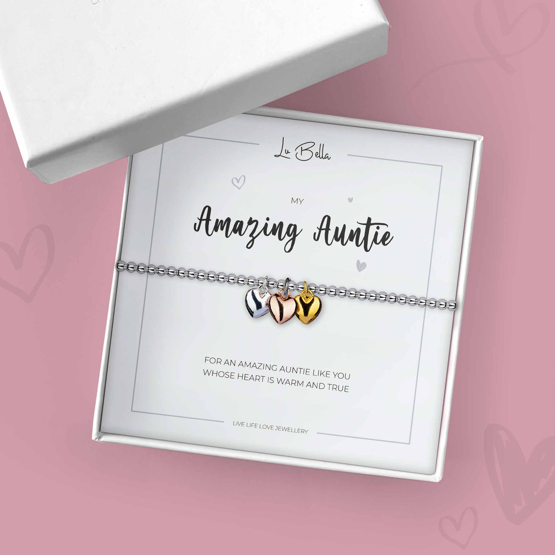 With 3 heart charms (silver, rose gold and gold) that all compliment each other, accompanied by a lovely little sentiment that reads 'For an amazing auntie like you, whose heart is warm and true'... It's a card and gift in one.