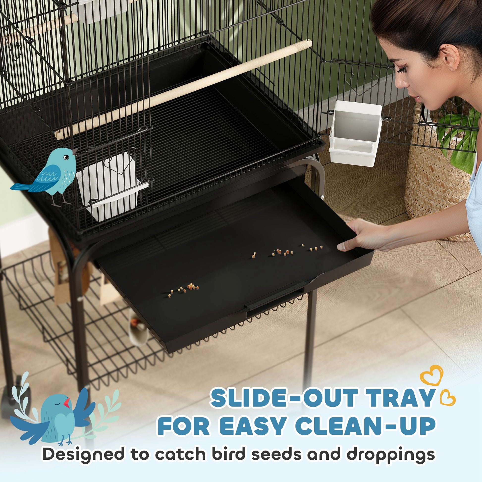This PawHut bird cage oozes space and comfort, providing your birds with an excellent home to thrive. With two plastic perches, it's great for finches, canaries, budgies and similar birds. It has a large front door, two sliding food doors and rolls effortlessly on four wheels. The bottom shelf keeps supplies close for extra convenience. Enjoy this easy-to-clean cage, featuring a removable tray that can be wiped clean, whilst the bottom net separates droppings for better hygiene.Specifications