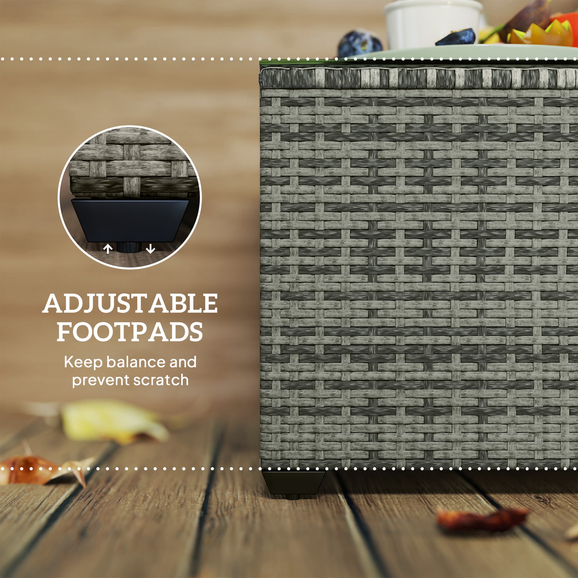 Forever style for your garden with this rattan garden table. A galvanised steel frame with powder coating for a strong core structure wrapped in tough plastic rattan, the garden side table effortlessly matches your current rattan garden furniture. It's fitted with a 5mm thick tempered top for a sleek touch and a safe holding place. Complete with adjustable feet for stability.Specifications