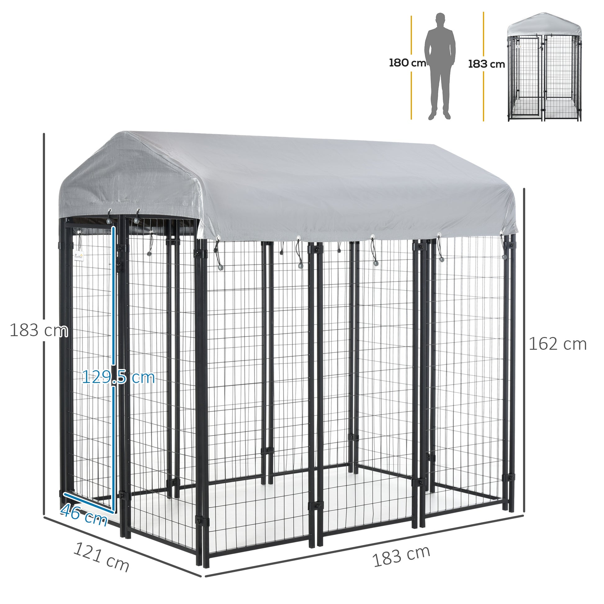 - Protective tarp covering: The roof is resistant to water and UV, providing shelter on rainy days and shade on sunny days - it's also slanted so rainwater falls off instantly. Elastic cords attach the cover firmly to the frame. The perfect dog run for outside.