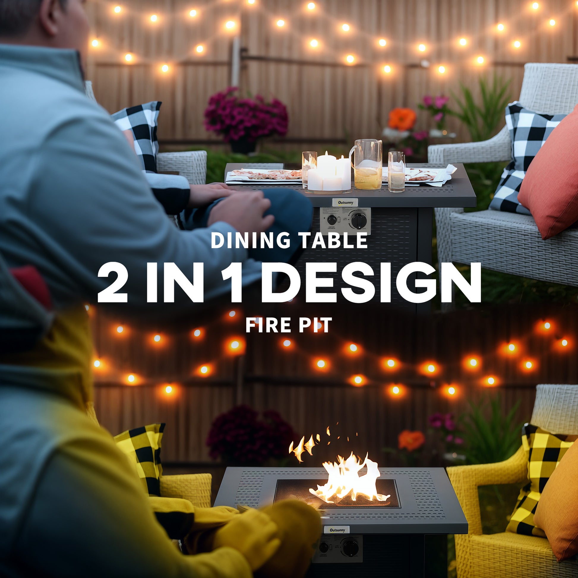 Enjoy garden warmth and ambiance all year-round with this Outsunny fire pit table. The rattan-effect design is stylish, looks great matched with other furniture. The tabletop is fitted with a centre fire pit - the 40,000 BTU burner is powerful and produces a clean smokeless burn. The flame can be adjusted too. The thermocouple closes the valve if the flame goes out for safety - no leaking gas. Lid included to turn into a standard table when needed.Specifications
