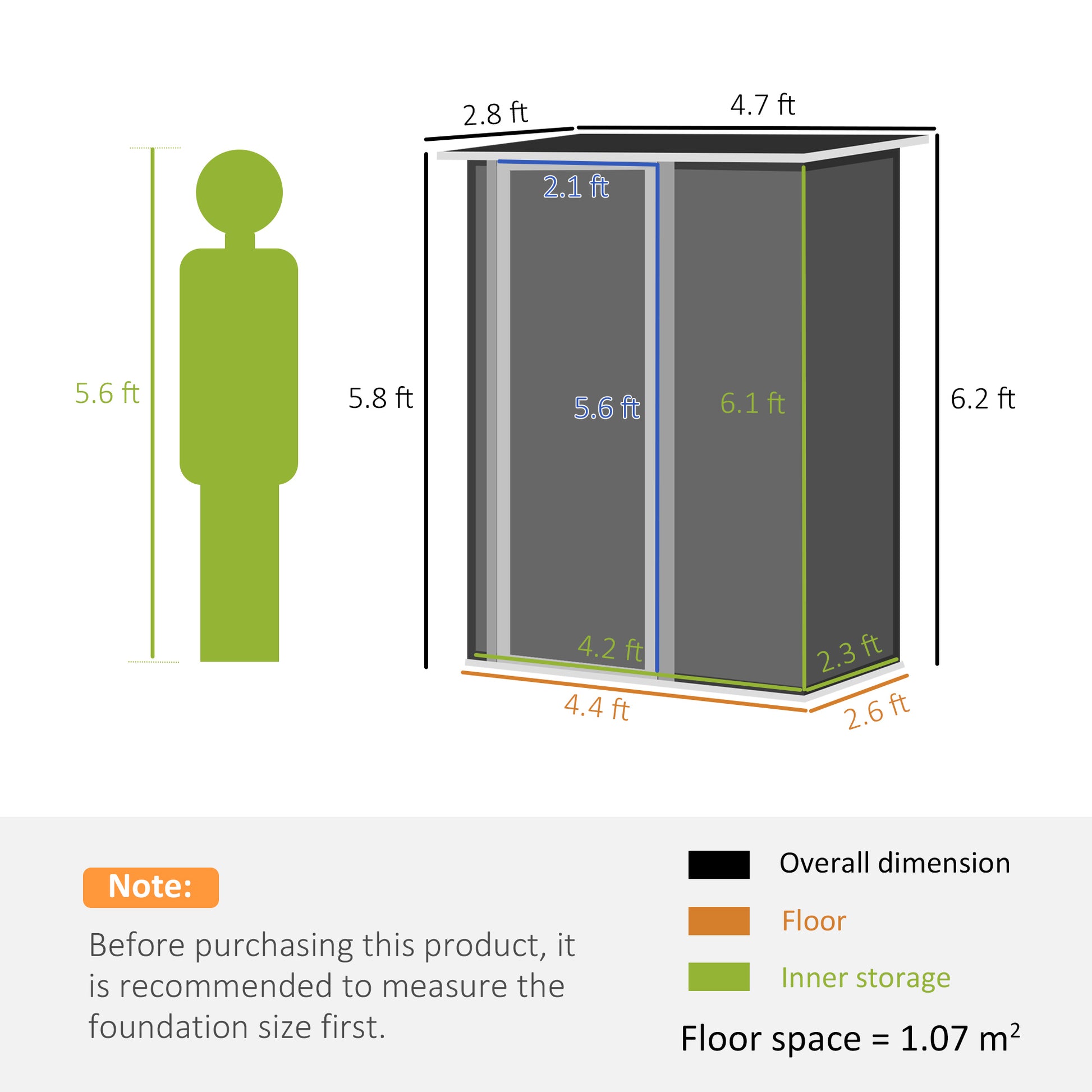 Keep garden equipment and more somewhere safe and protected. Look to this garden shed. Made from metal, it's tough - with a weather-resistant paint on top to make it suitable for outdoor use. The sloped roof prevents liquids building up. Inside, the space is completely free so you can store anything you want which fits in the space. How abbot adding a shelving unit if you want an organised inner space? Foundation kit not included.Specifications