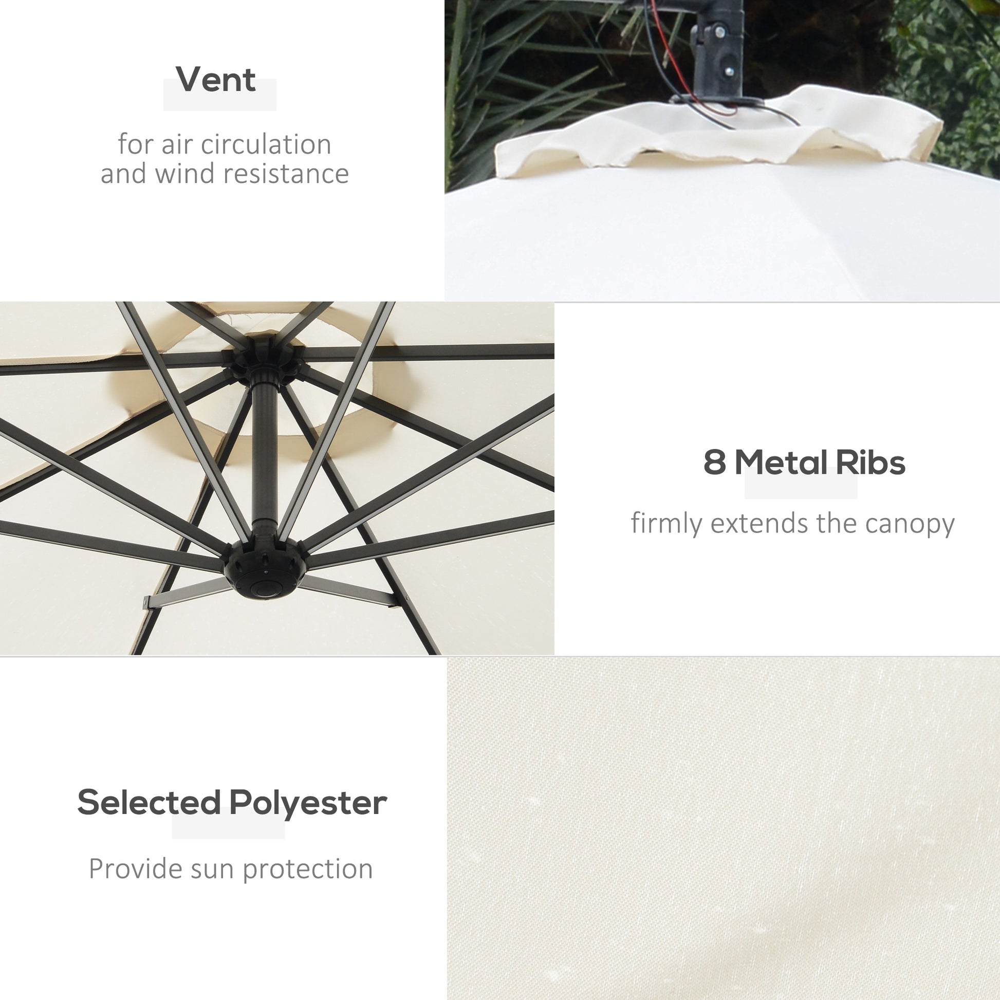 3(m) LED Cantilever Parasol Banana Garden Umbrella with Solar Lights, Crank Handle and Cross Base, Hanging Sun Shade, Off-White