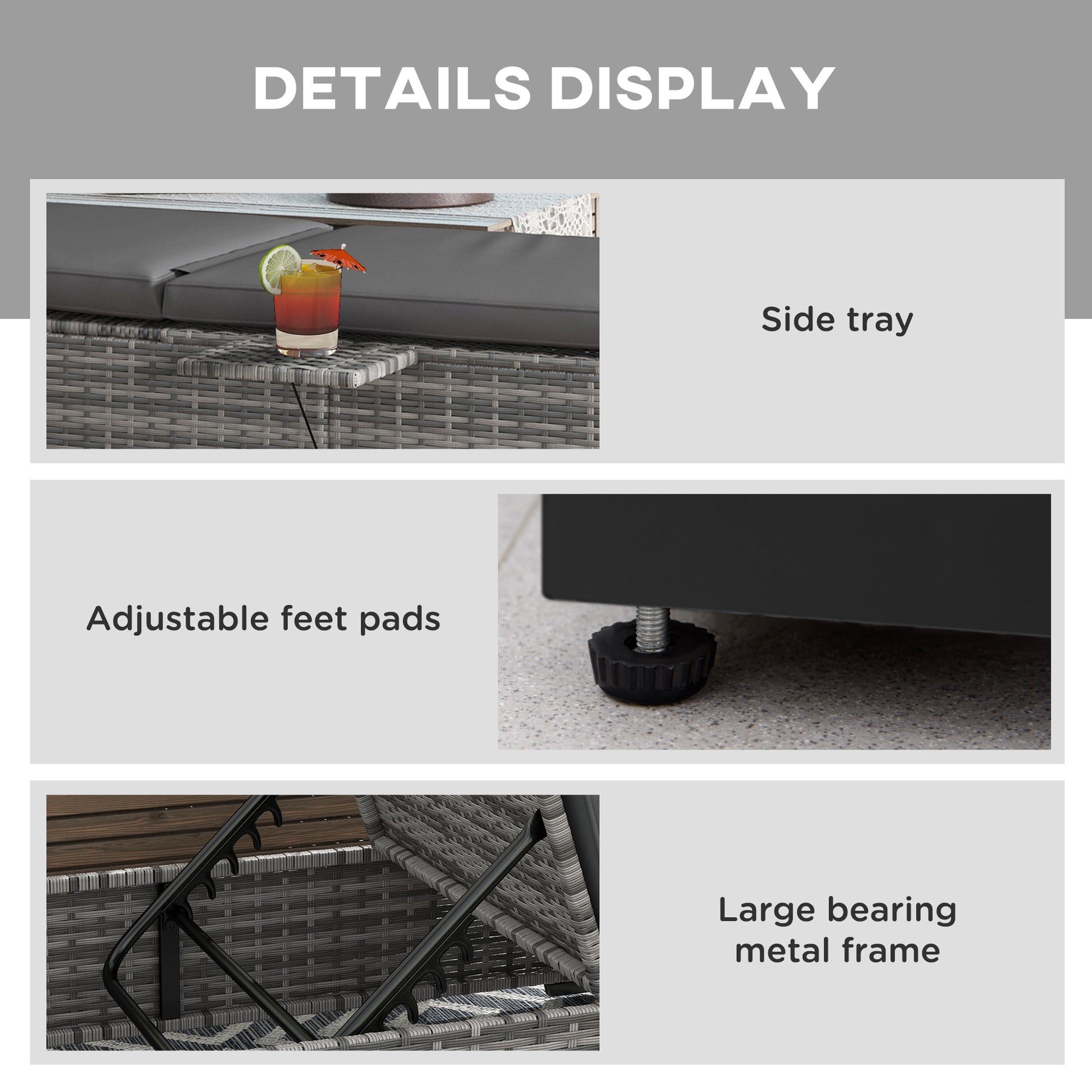 Patio PE Rattan Lounger w/ Cushion, 5-Level Reclining Wicker Rattan Sun Lounger w/ Tea Tray, for Poolside, 120kg Weight Capacity, Grey