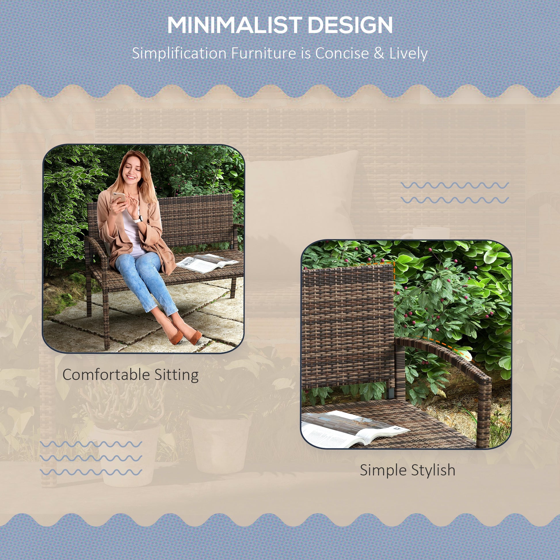 Bring a new stylish feel to your outdoors with this bench . It's formed of a two layer design: a metal frame for a strong structure, wrapped with PE wicker for extra protection and durability. The brown colour is stylish and blends in with other garden furniture easily. The two-seater design gives room to relax with a friend, finished with a high back and armrests for support. Minimal upkeep, with maximum comfort and delight.Specifications