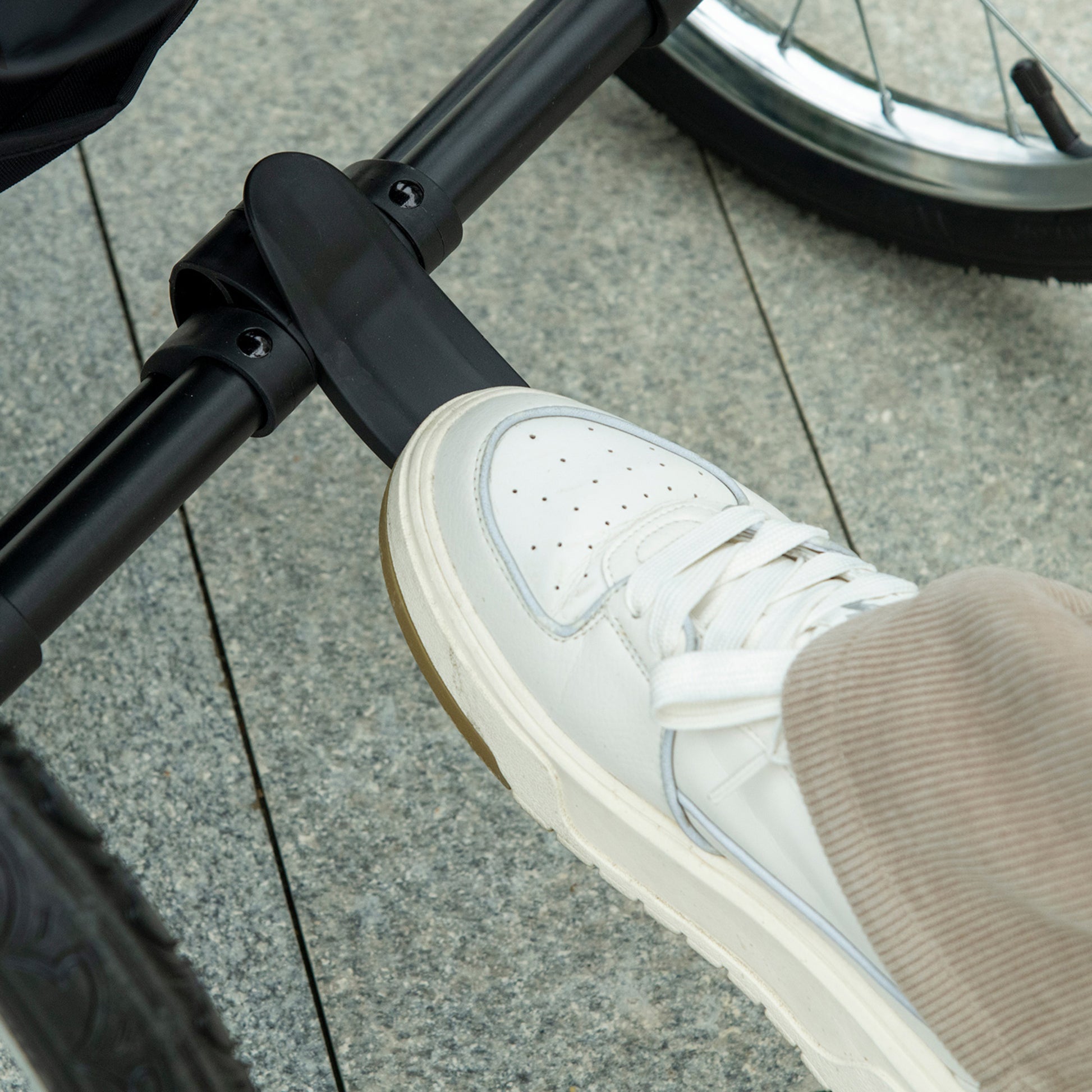 - Three large rubber wheels, suitable for all terrains. The front wheel is lockable