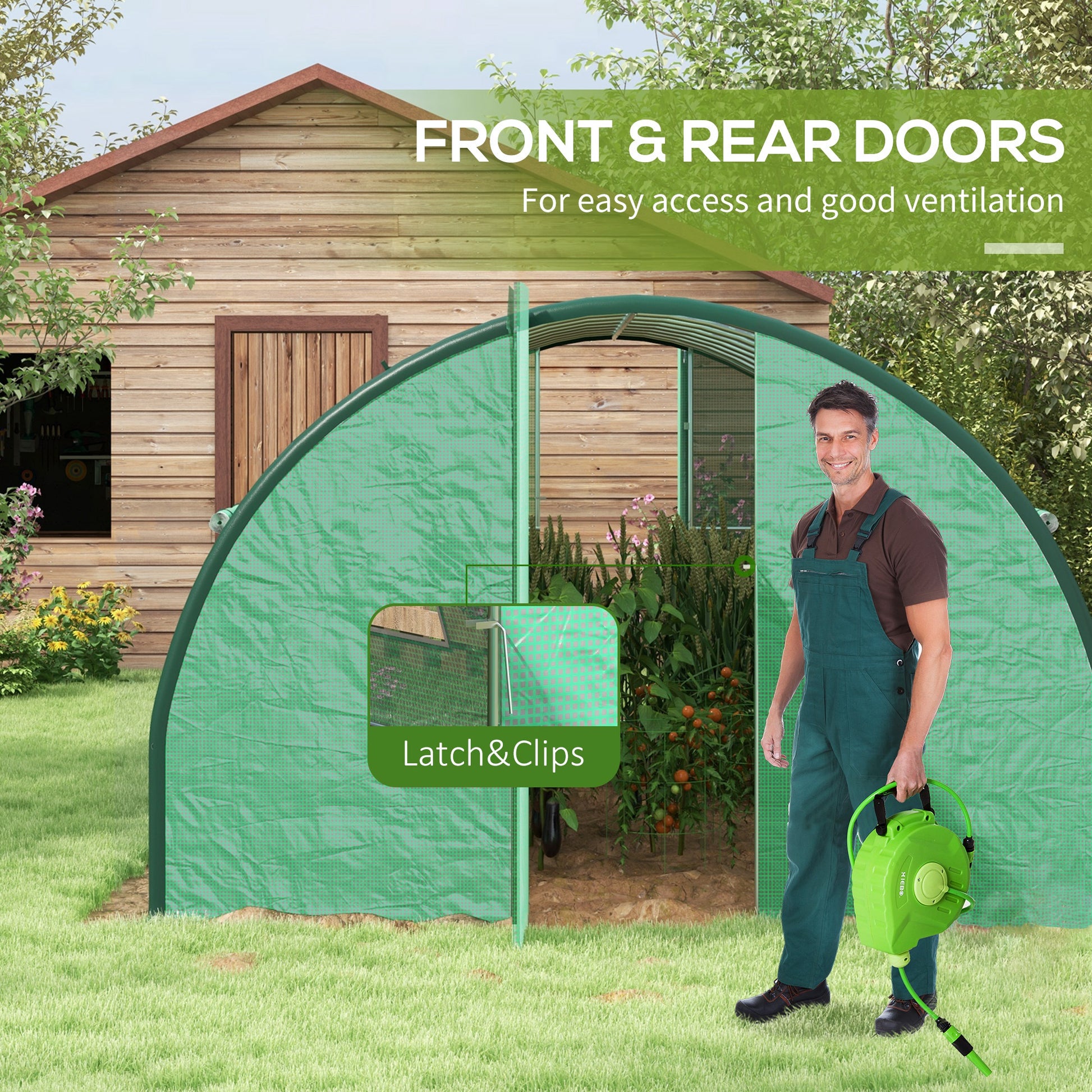 - Hinged doors and mesh windows: Two hinged doors, with latches, for easy access in/out this garden polytunnel. Eight mesh screen windows to allow inside whenever you need.