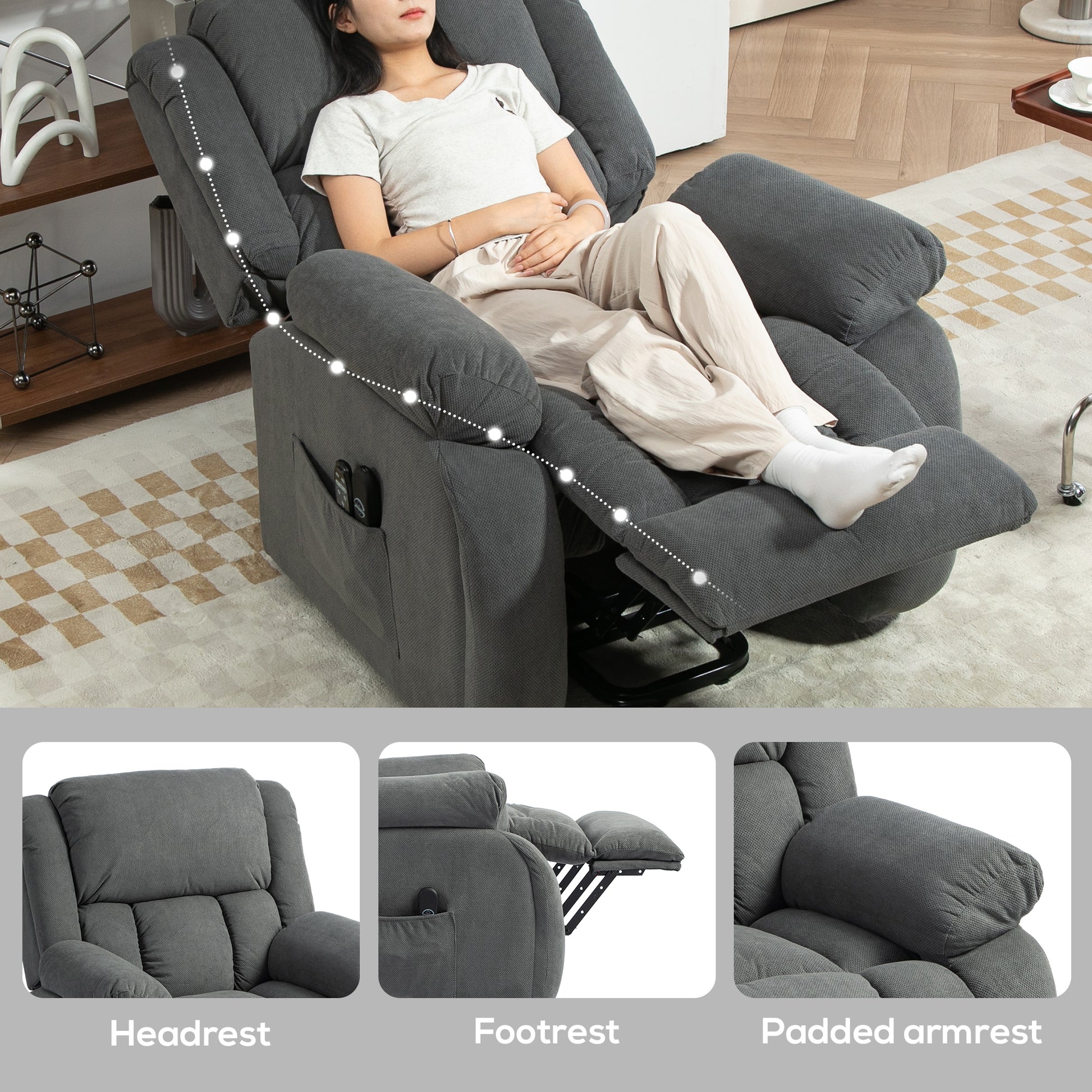Ease into relaxation with the Recliner Armchair Lift Chair. Effortlessly rise or recline, offering tailored comfort. Enjoy soothing massages with eight vibration points and lumbar heat, melting away stress from head to toe. Upholstered in velvet-feel fabric with overstuffed cushioning, this reclining chair is your cosy retreat after a long day. Stay connected with a handy USB port for charging.Specifications