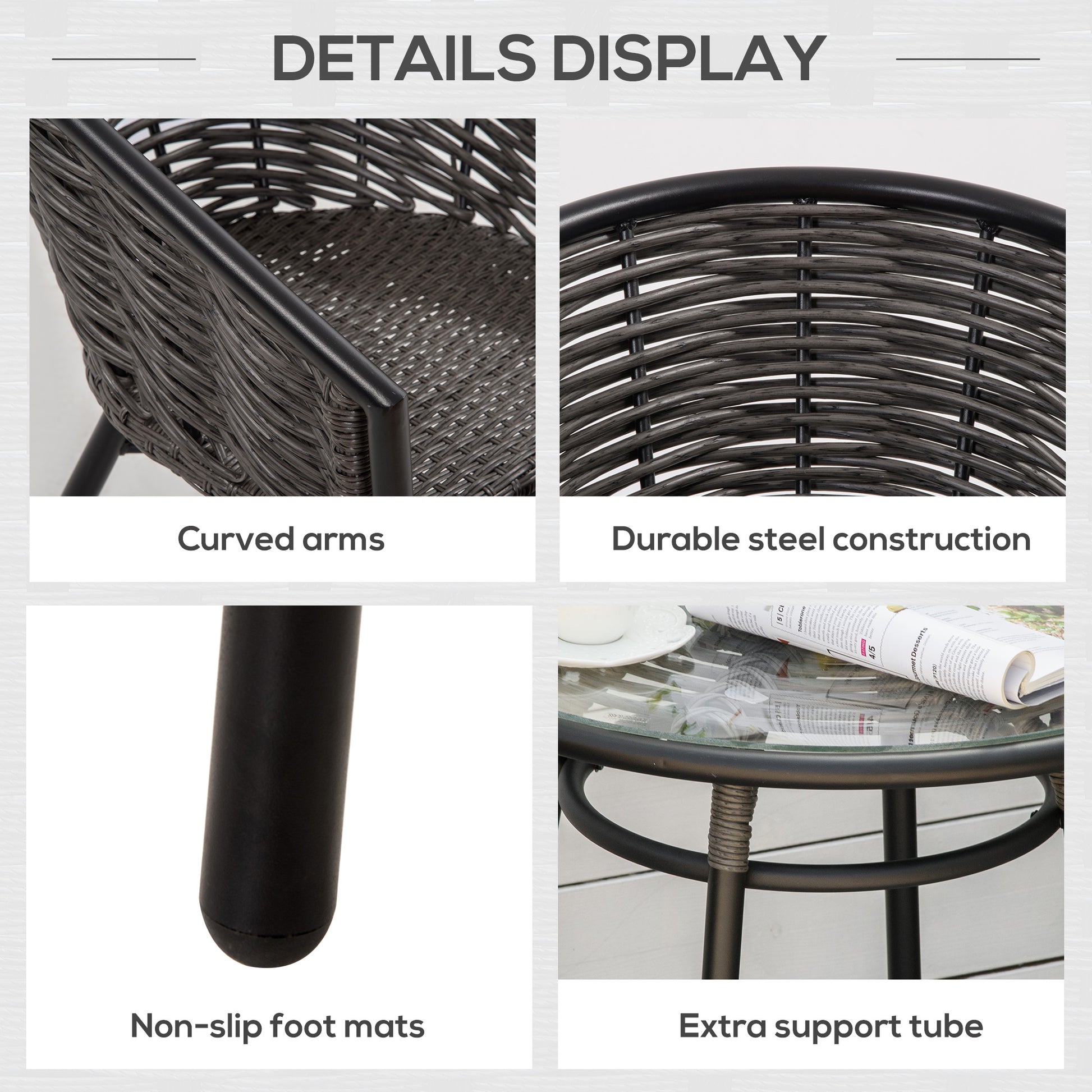 Outsunny 3 Pieces Outdoor PE Rattan Balcony Furniture, Round Wicker Patio Table and Chairs w/ 2 Armchairs & Glass Top Coffee Table Conversation Furniture Sets, Grey