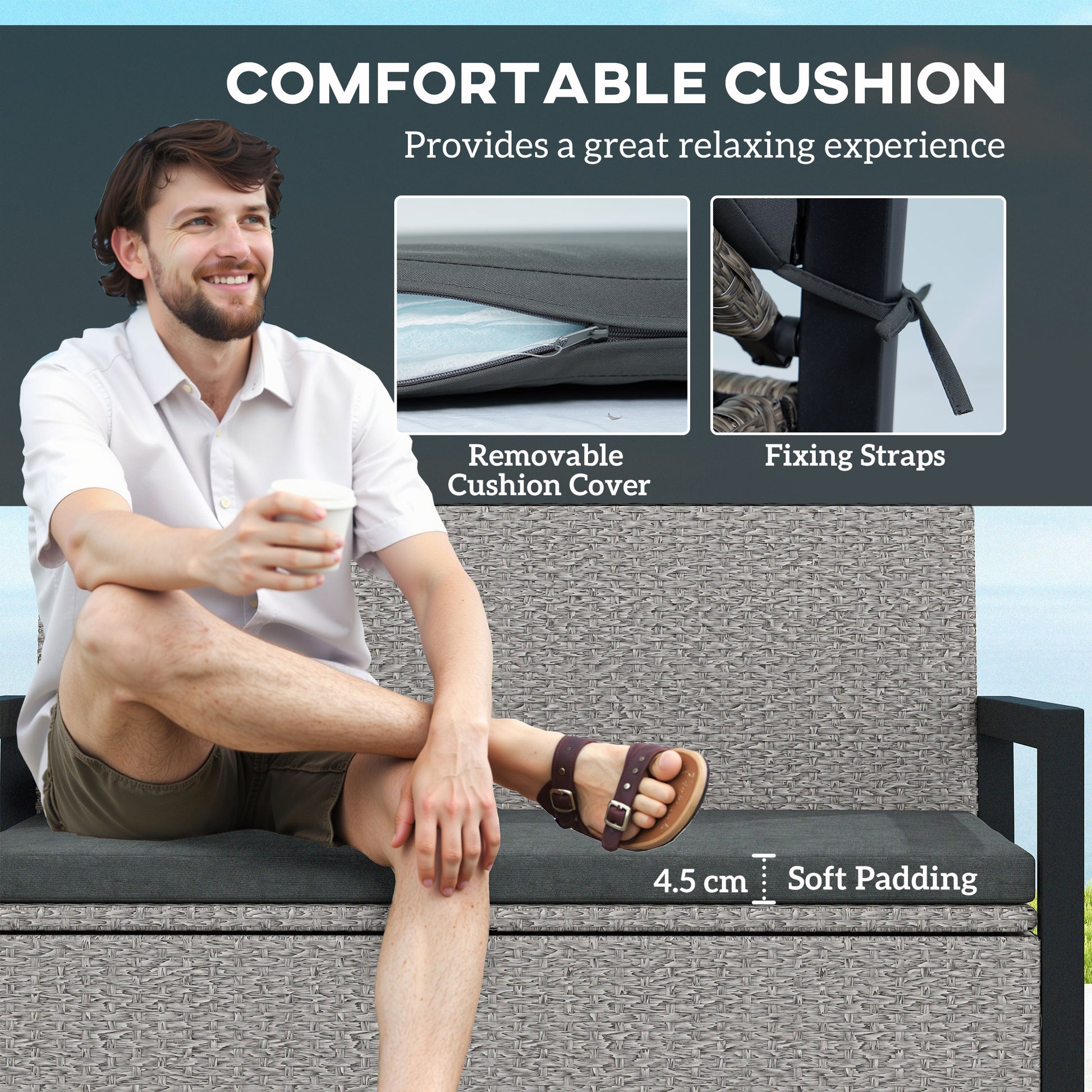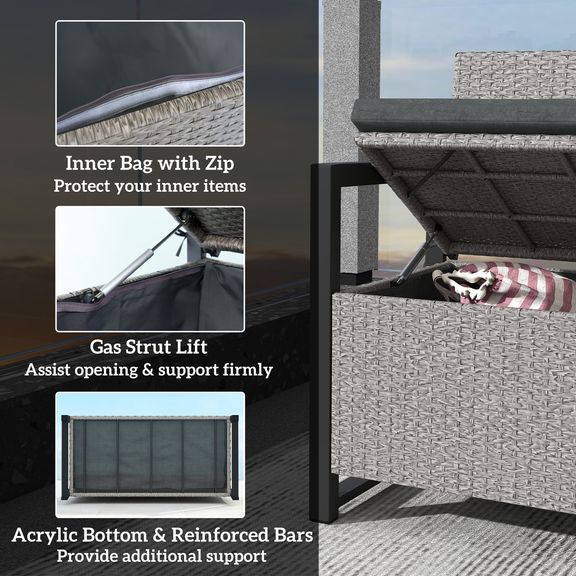 Experience relaxation and convenience with the rattan storage bench, featuring a robust powder-coated steel frame enveloped in stylish plastic wicker. This garden storage seat includes a 151.5L storage inner compartment with a protective zipped inner bag, ensuring your items remain secure. A padded seat cushion adds comfort, making it an excellent t addition to your outdoor space.Specifications