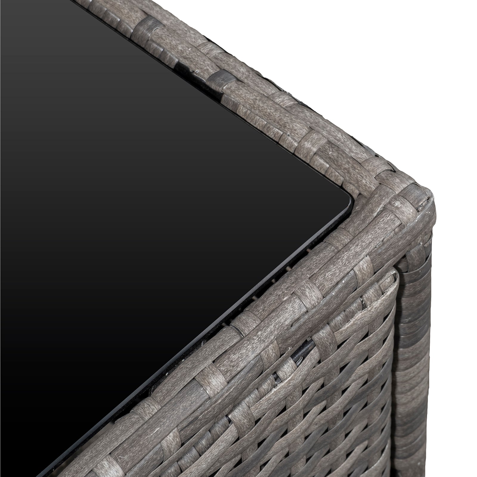 - Stylish outdoor seating set consisting of four seats, two corner seats, a corner table and a coffee table with a sleek tempered glass top