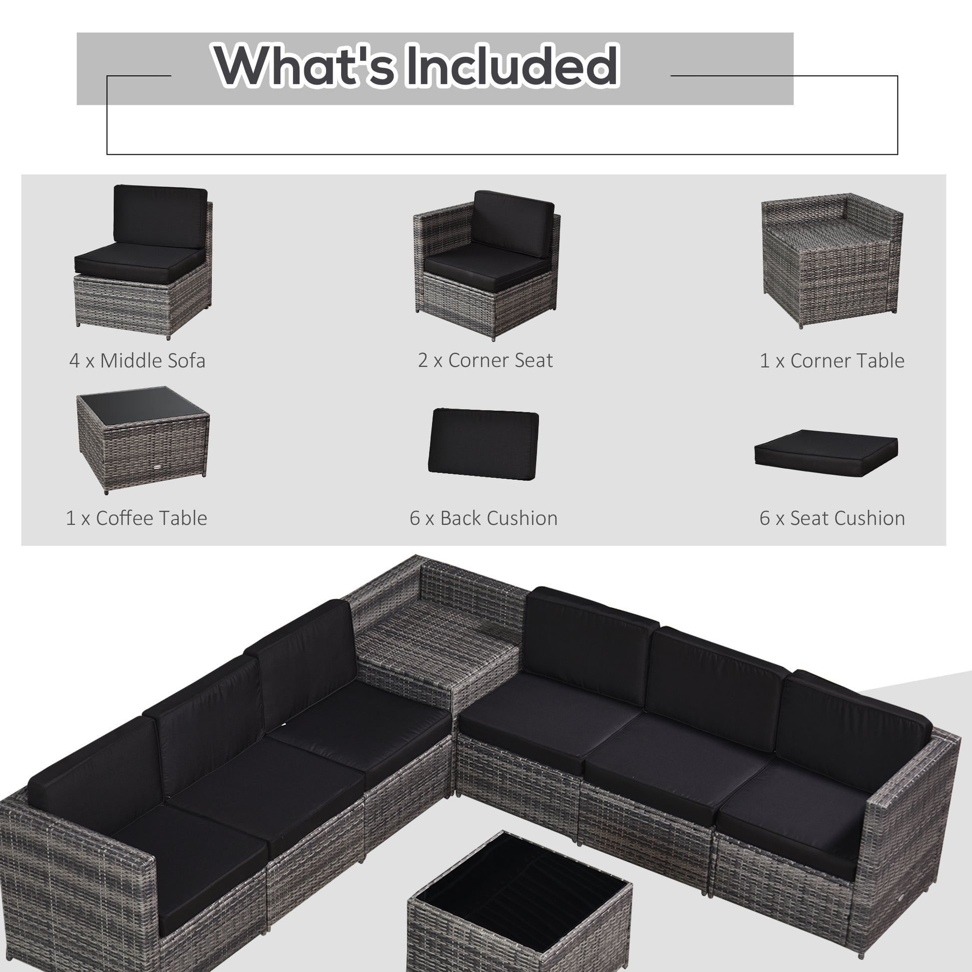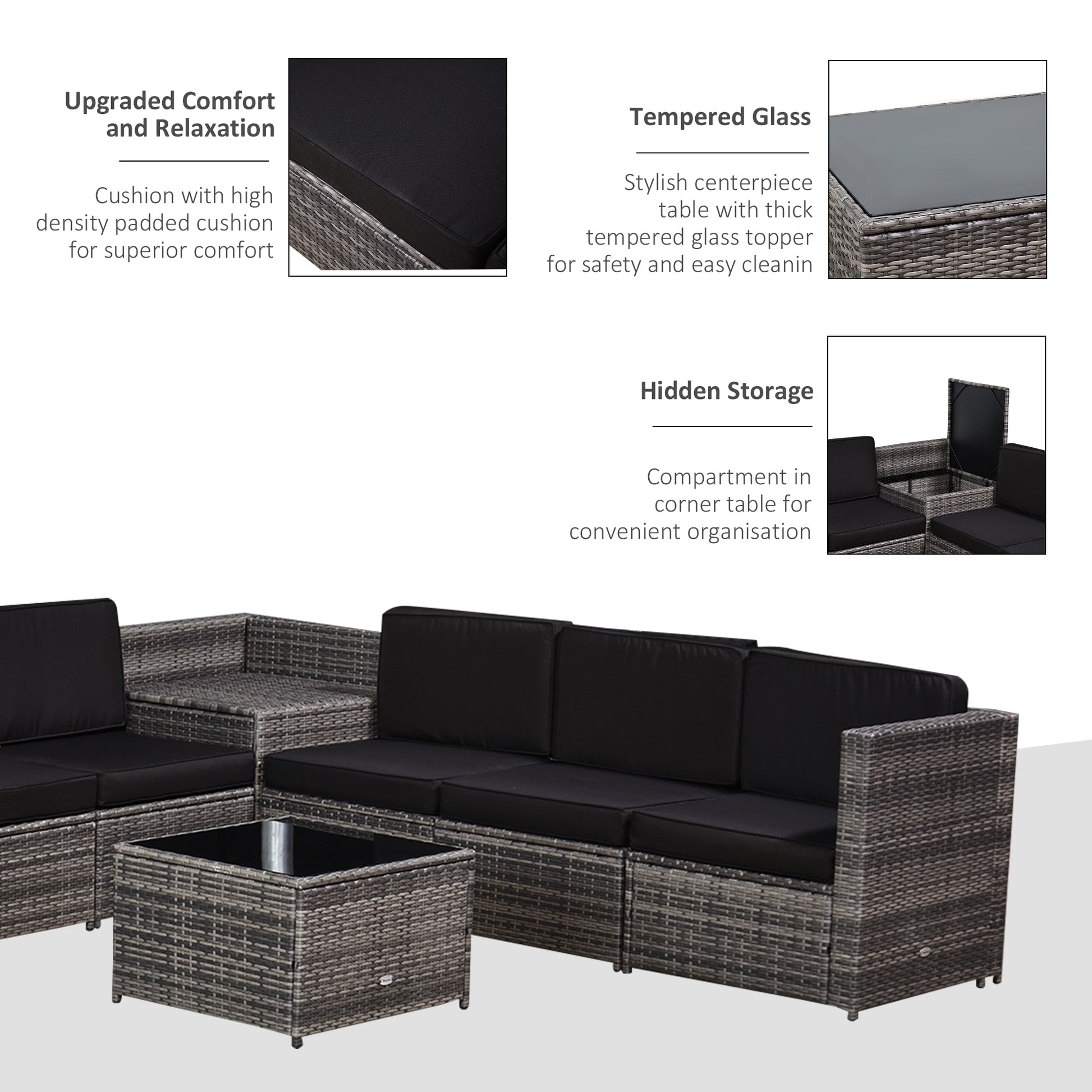 Outsunny 8 pcs Outdoor Rattan Garden Furniture Patio Sofa and Table Set with Cushions 6 Seater Corner Wicker Seat with Storage, Grey