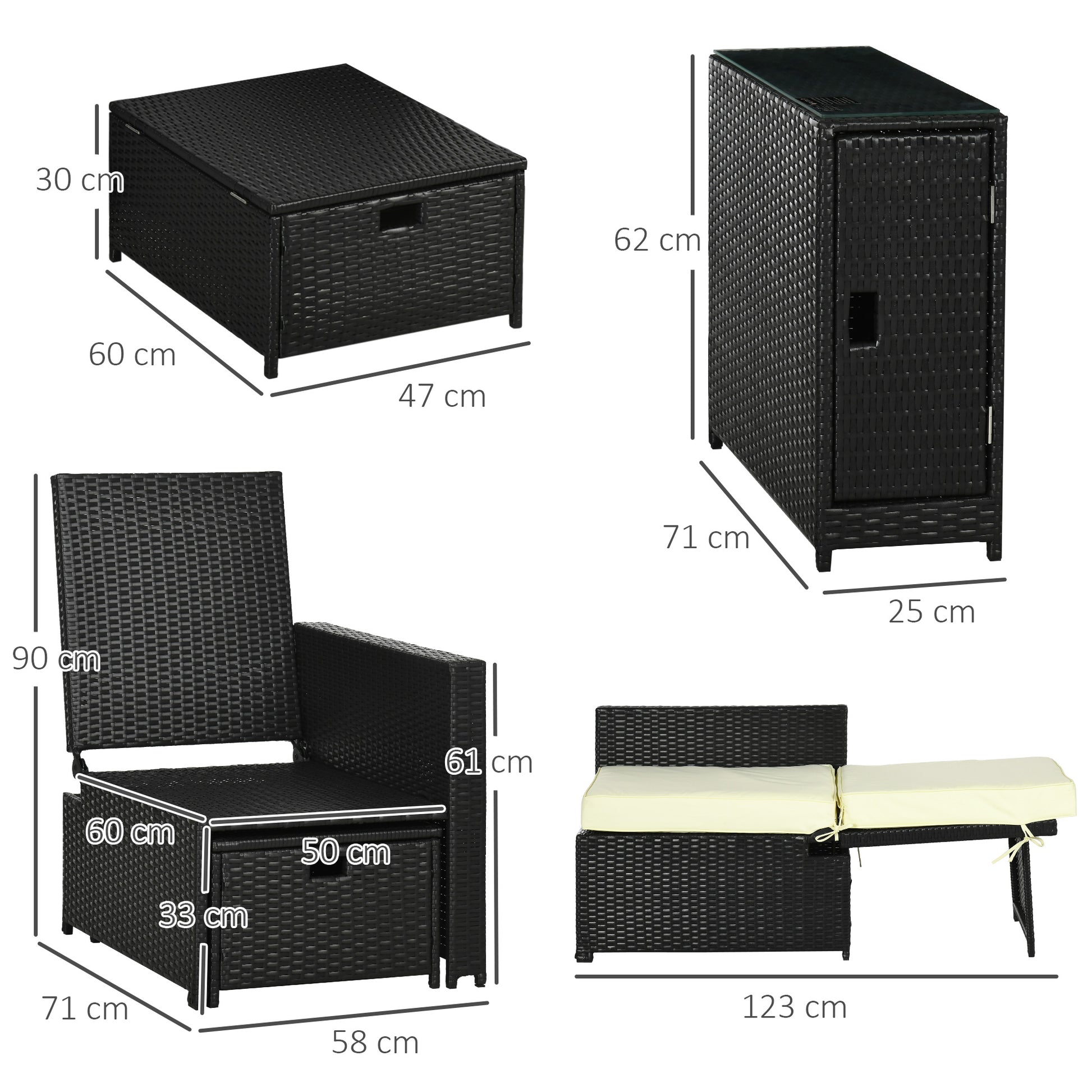 - This Outsunny set combines reclining garden furniture, with storage and most importantly, somewhere to relax with a friend. It comes with two reclining chairs, two storage footstools and a tempered glass-top table. Both chairs feature a reclining back: set to five different angles so you can relax the way you want to. A steel frame forms each piece for strong support, wrapped in stylish plastic rattan: a garden-ready look to be used this season and beyond.