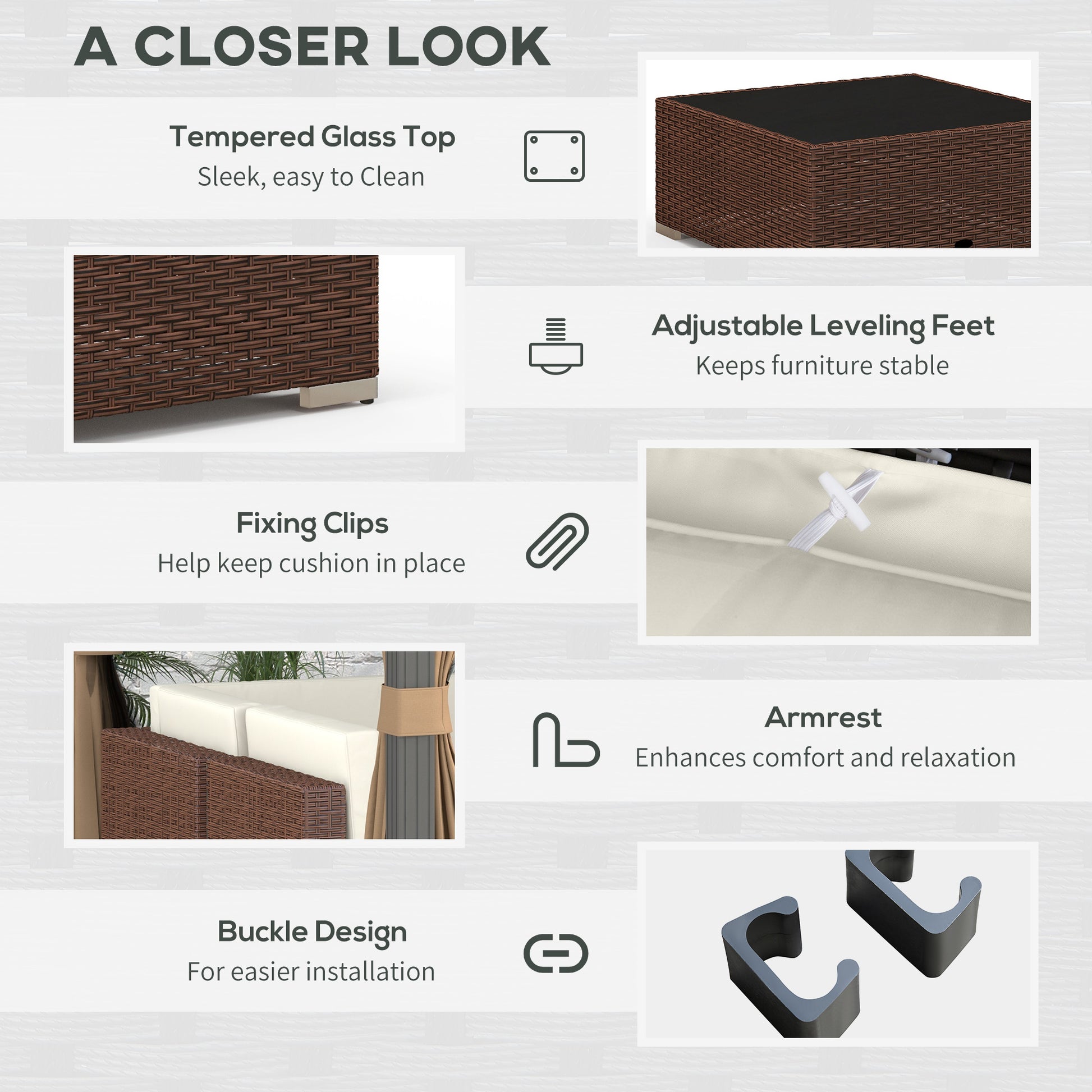 Bring beauty and comfort into your garden with patio set. The steel frame of each piece means a strong, supportive structure; wrapped in PE wicker, the rattan top offers extra protection and style. Padded seat and back cushions provide comfort, with two extra pillows included. The rattan corner sofa is easy to assemble, with the buckle fastenings keeping all pieces secure. Set is completed with a safe tempered glass top on the table for a sleek look.