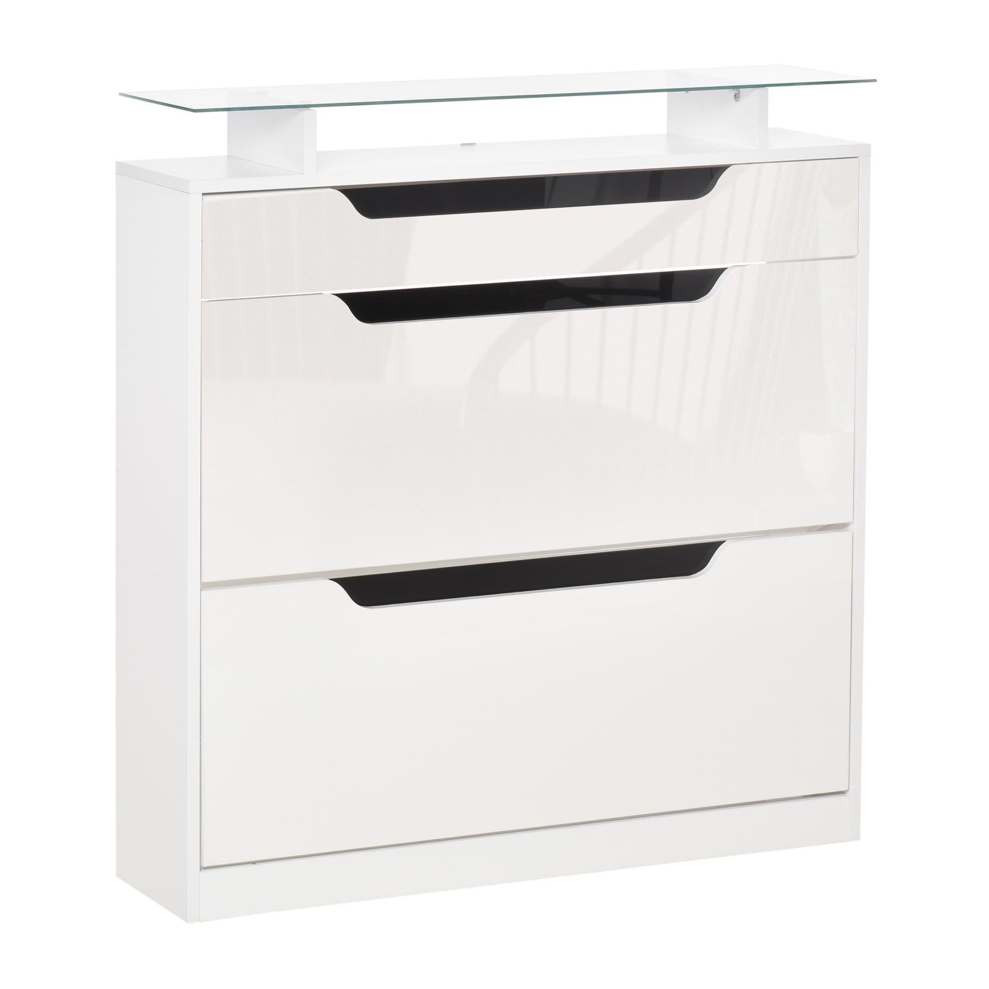Give shoes and more somewhere stylish and protective to keep them - grab this narrow shoe cabinet from HOMCOM. There are two flip drawers, each can hold eight pairs - perfect for use with the family or your flatmates. The inner shelf can be set to two different positions for storage which fits your shoes better. This tall shoe cabinet is made from a blend of MDF and particle board, so it’s durable. Finished with a handy top drawer and glass shelf, offering even more storage and display space.