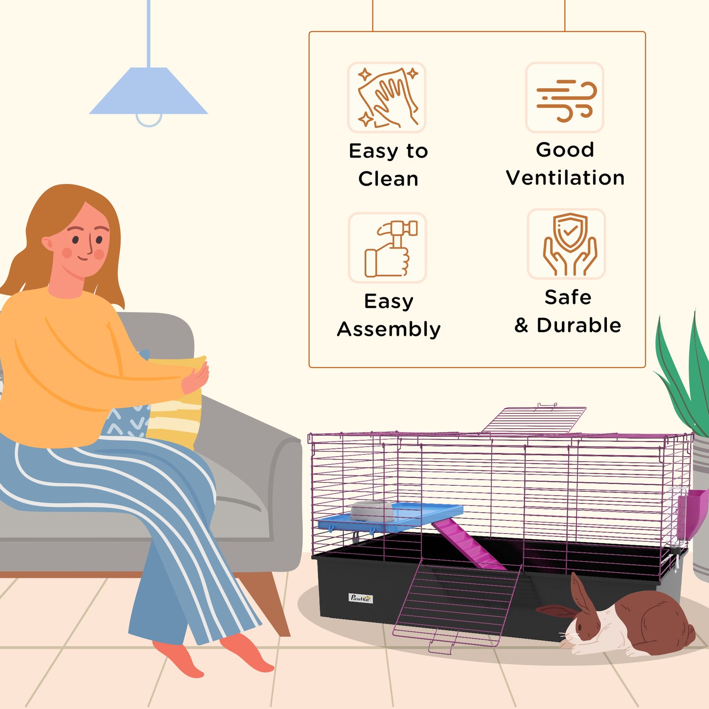 - Features a platform with a ramp, a hay feeder, a water bottle and a food dish