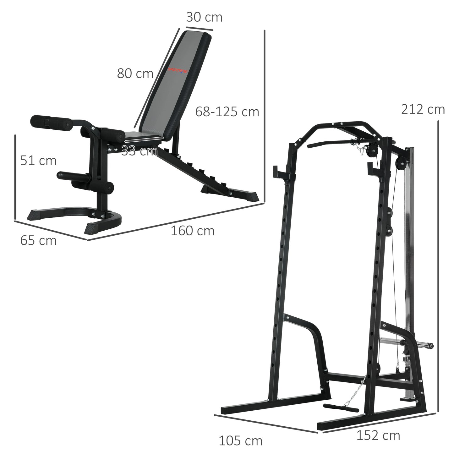 Easily integrate diverse exercises into your home gym with the strength frame and weight bench. Utilize a squat rack and bench combo for bench pressing with a barbell, incorporating pull-ups and lat pull downs into your fitness regimen. Our strength frame features an integrated cable system supporting up to 50 kg of resistance and a leg lift apparatus for up to 25 kg. Looking to build muscle? Simplify the process with our strength frame, available anytime your routine calls for it.Specifications