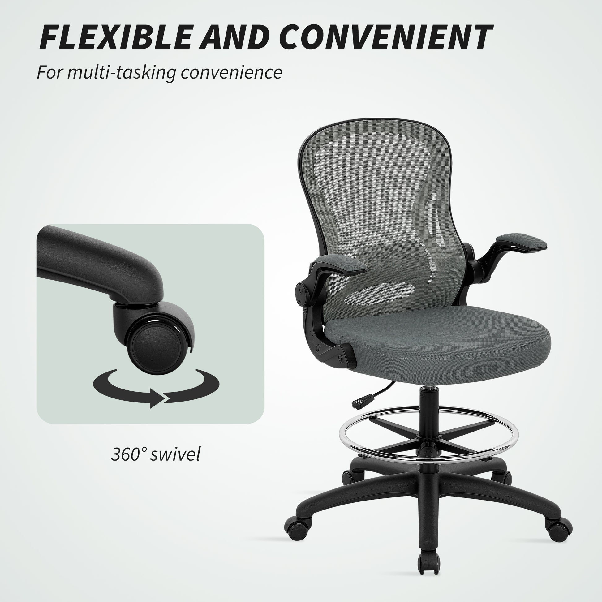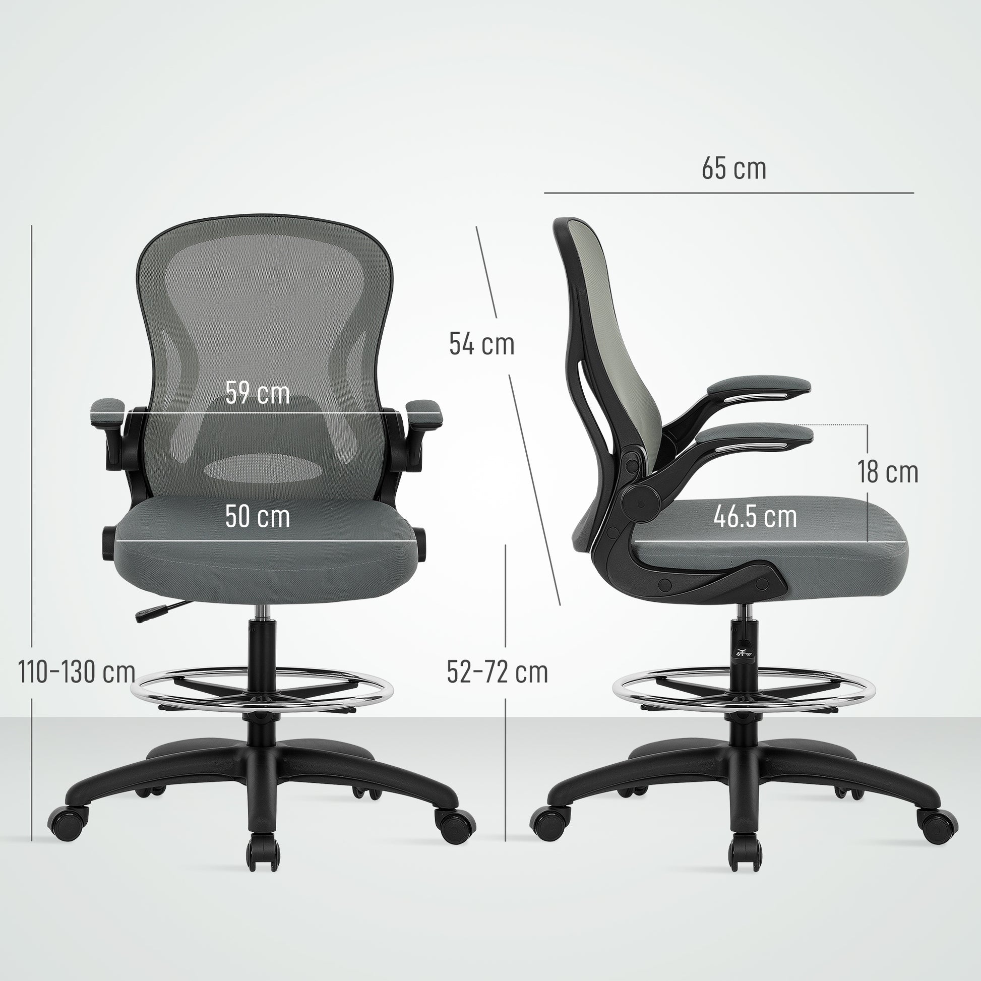 This mesh office chair, from Vinseto, comes in a draughtsman design - great for working at higher levels. Adjust the height between 52-72cm easily, thanks to the under-seat lever. The padded seat, curved mesh back, flip-up arms and five-wheeled base make it a pleasure to sit on and use, supporting you as you work. Adjust the bottom bar to rest your lower body comfortably. Tall surfaces? No problem!Specifications
