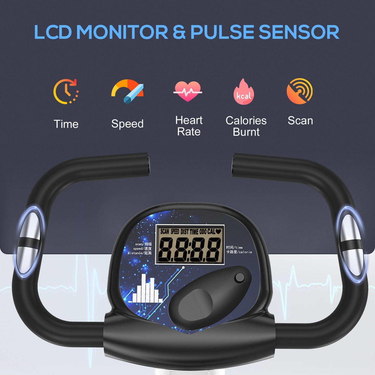 - LCD Monitor: The indoor cycling bike is equipped with LCD display which keeps track of your heart rate (via metal detecting panels on handlebar), speed, distance, time elapsed and calories burnt to record progress.
