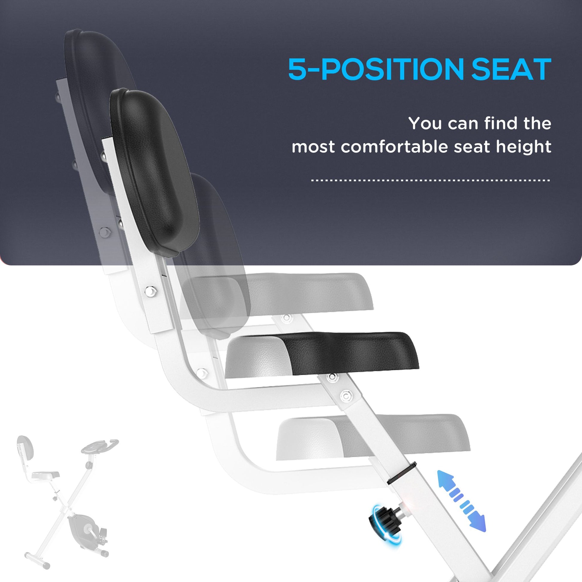 - Adjustable Seat: The seat of the stationary exercise bike can be set to five different heights to suit you, with a backrest offering support when leaning back. Large foot pedal with straps to keep feet stable. Applicable height from 155-180cm