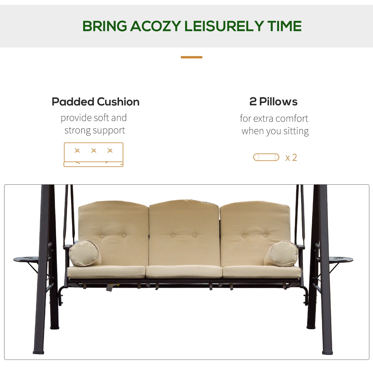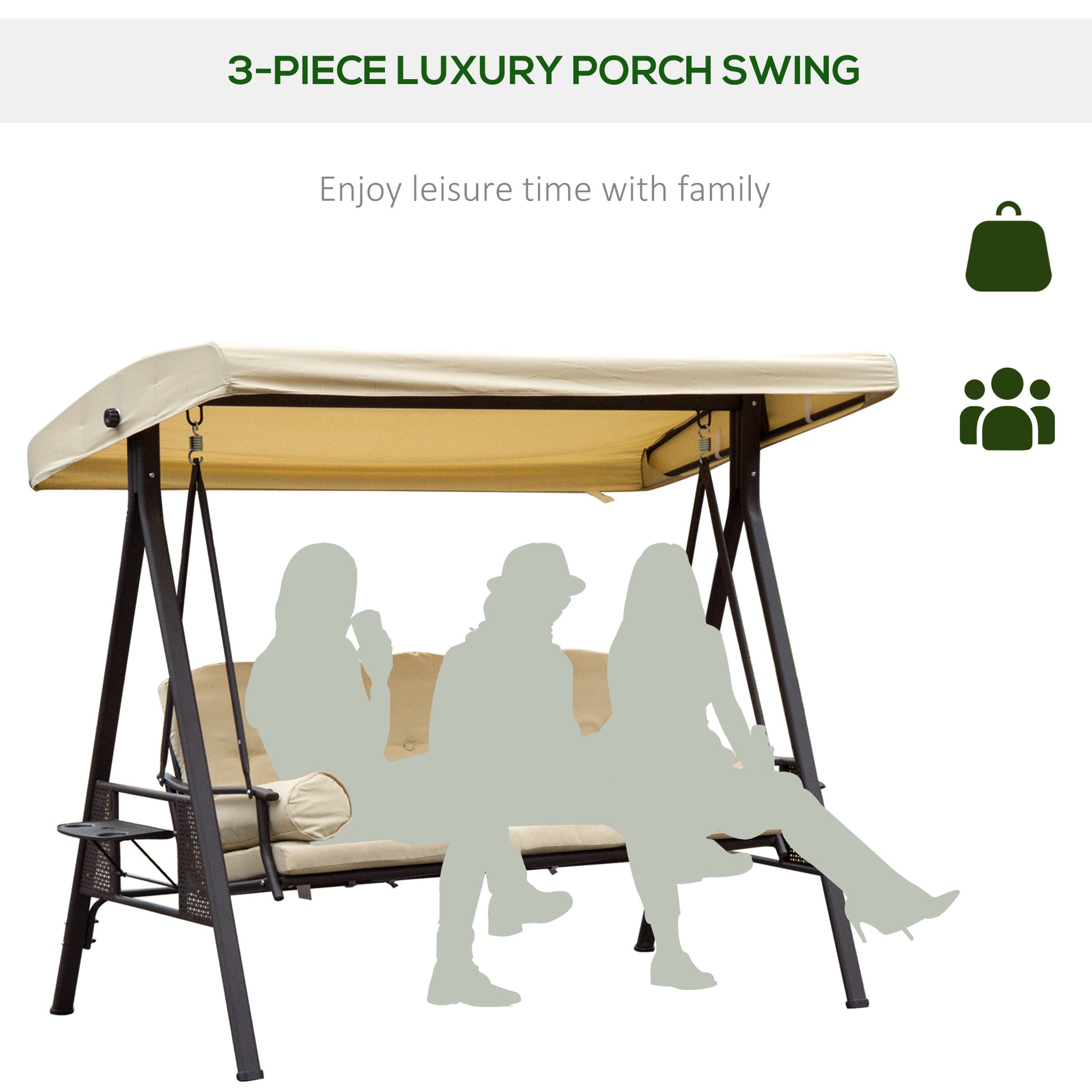 Outsunny is proud to present this stylish 3 seats swing chair. It features an arc-shaped canopy and flower-shaped seat back for aesthetic beauty. The top canopy provides sunshade for you while the storage trays on both sides makes essentials within reach. There are 3 seats for your family and friends to swing together in maximum comfort thanks to padded cushions. Your patio, garden, Deck, yard or lawn, wherever you place it, the eye-catching chair is designed bring elegance to your outdoor living area.