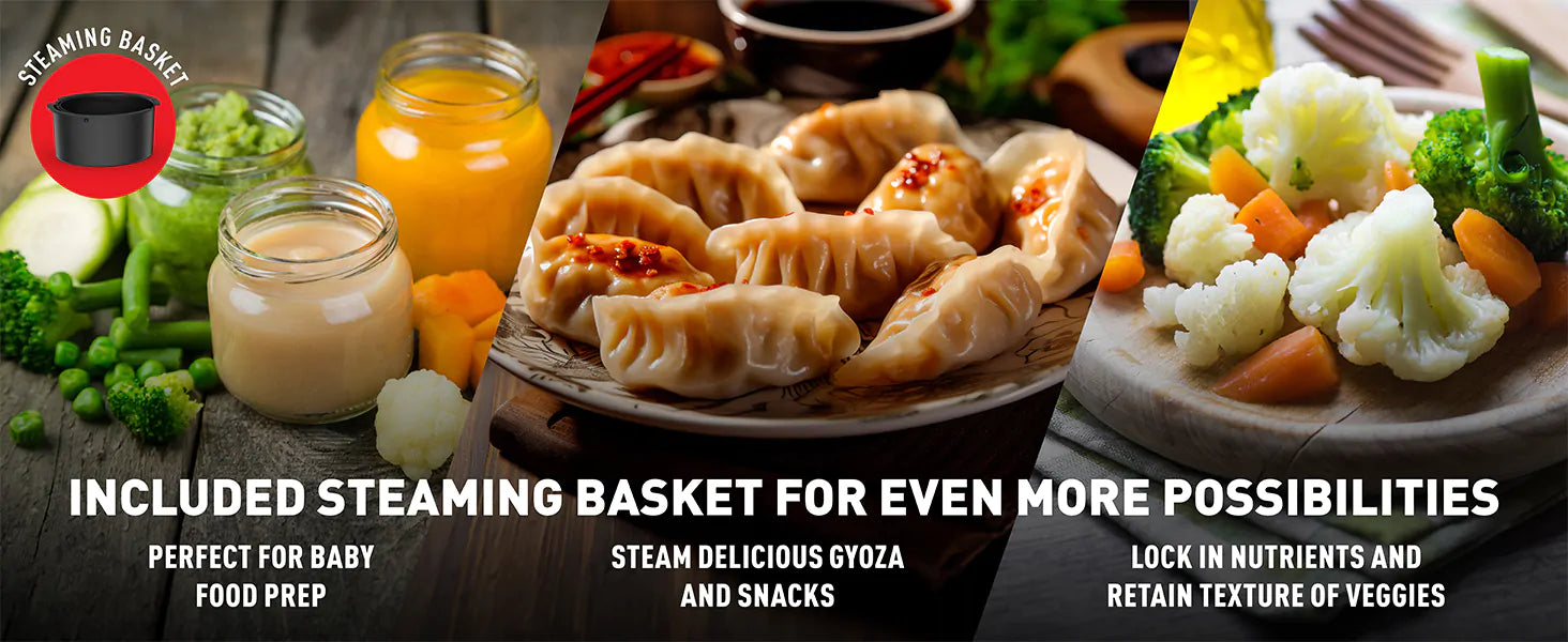 | Dishwasher Safe | Lid, steam basket, dosing cup |