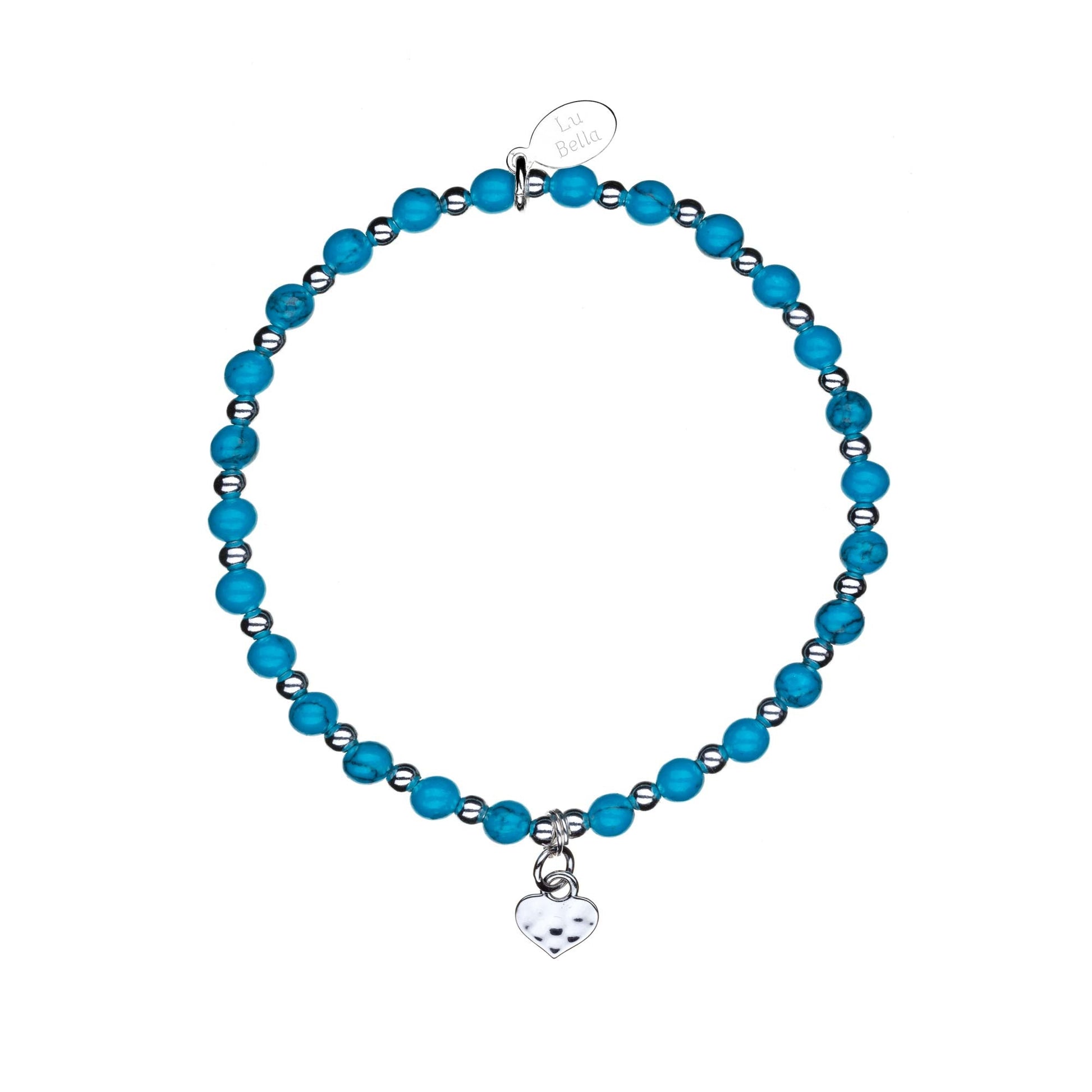 Our Turquoise bracelet is a beautiful, cool and calming colour that extends its fresh beauty when paired with Silver. Our stunning 6mm/4mm turquoise beads have powerful blue tones with a delicate natural veining that serves to enhance it’s character and bringing a welcome brightness to an everyday outfit. This simply beautiful bracelet includes a sweet little hammered heart Charm.
