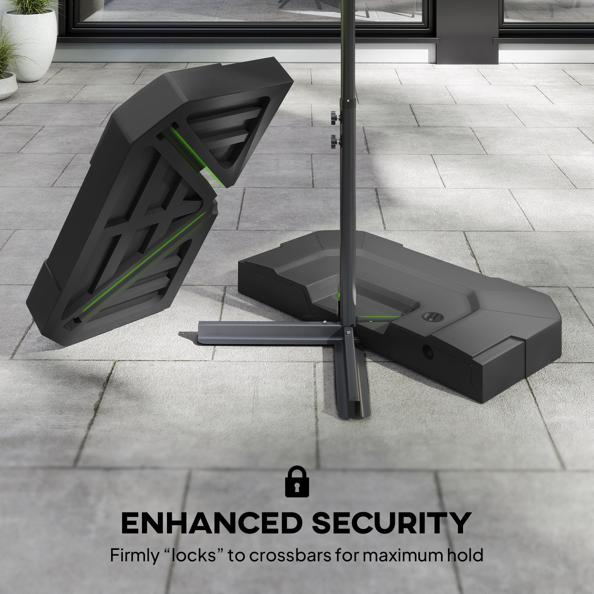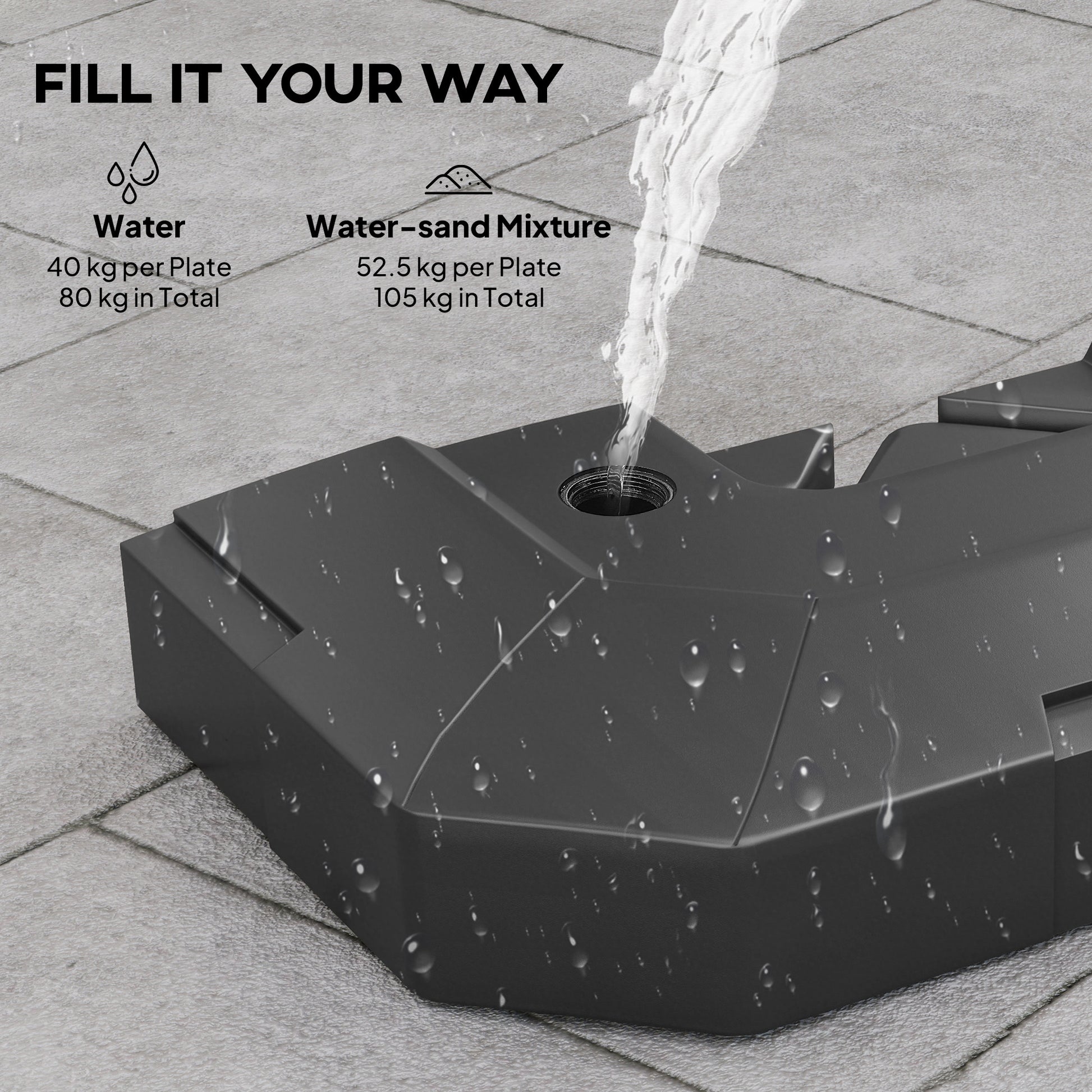 Keep your cantilever umbrella steady with the two-piece cantilever offset umbrella base weights. Designed for cross-base cantilever umbrellas (cross base not included), each plate can be filled to reach a total weight of up to 40 kg with water or 52.5 kg with a sand-and-water mix. Made from all-weather HDPE, these weights resist ageing and outdoor wear, helping keep your garden umbrella upright, secure and ready for sunny daysSpecifications