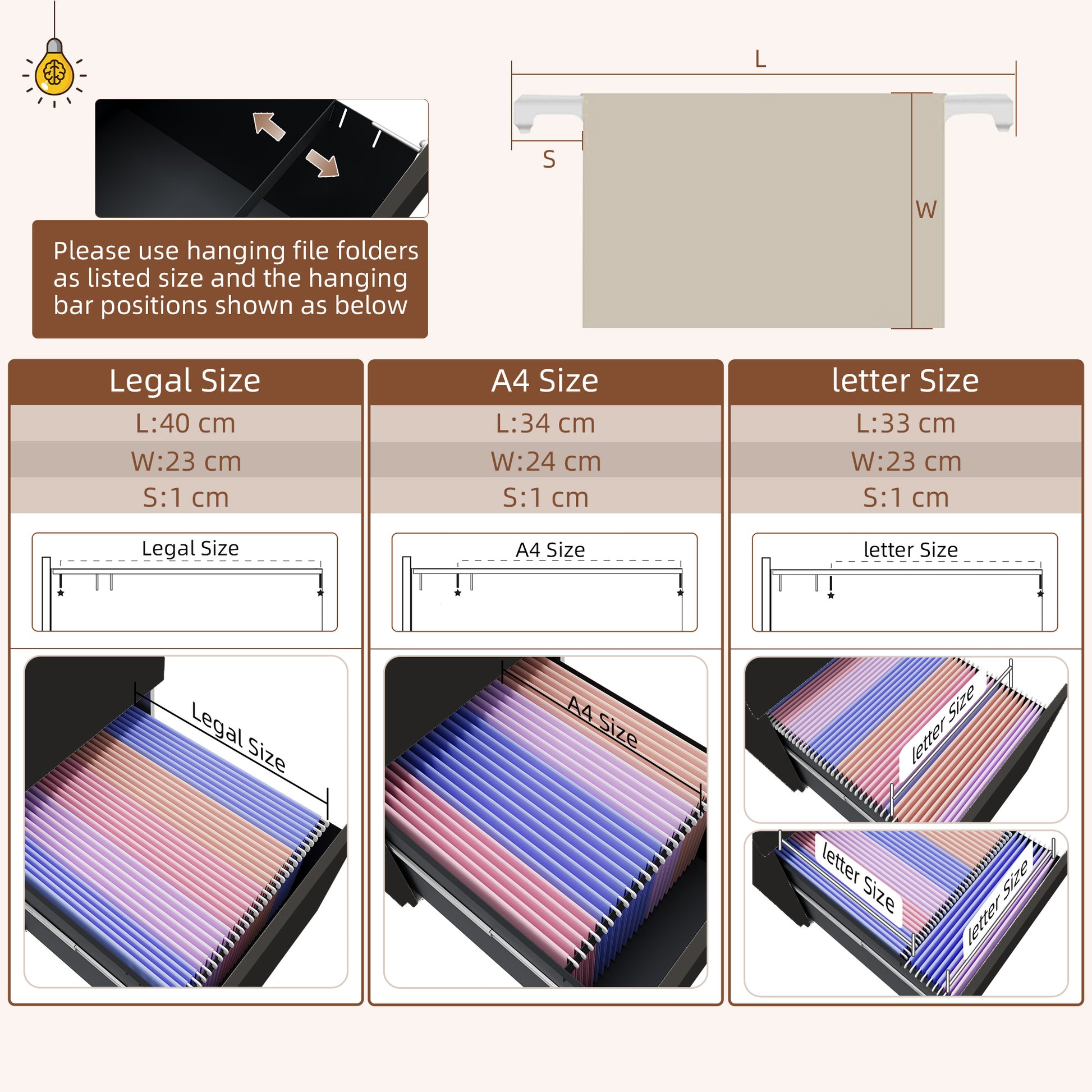 - Adjustable hanging bar in bottom bar for letter, A4 and legal sized files